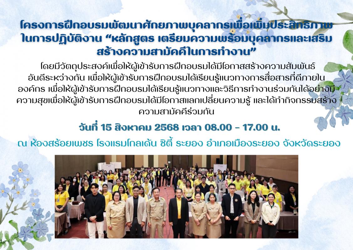 โครงการฝึกอบรมพัฒนาศักยภาพบุคลากรเพื่อเพิ่มประสิทธิภาพในการปฏิบัติงาน “หลักสูตร เตรียมความพร้อมบุคลากรและเสริมสร้างความสามัคคีในการทำงาน” วันที่ 15 สิงหาคม 2568 เวลา 08.00 – 17.00 น. ณ ห้องสร้อยเพชร โรงแรมโกลเด้น ซิตี้ ระยอง อำเภอเมืองระยอง จังหวัดระยอง 15 สิงหาคม 2568 348