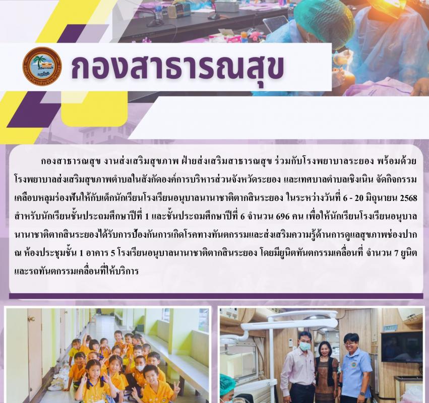 กิจกรรมเคลือบหลุมร่องฟันให้กับเด็กนักเรียนโรงเรียนอนุบาลนานาชาติตากสินระยอง ในระหว่างวันที่ 6 - 20 มิถุนายน 2568 สำหรับนักเรียนชั้นประถมศึกษาปีที่ 1 และชั้นประถมศึกษาปีที่ 6 6 มิถุนายน 2568 327