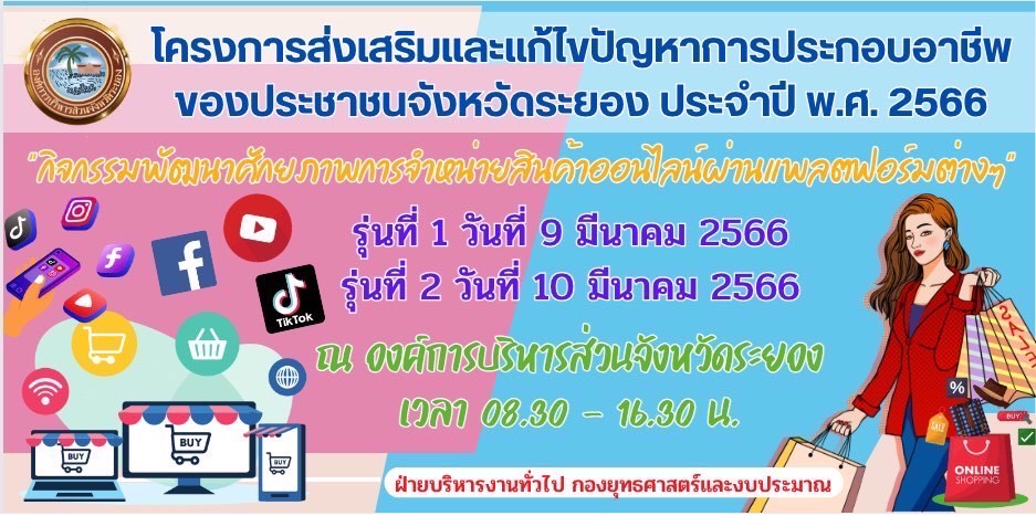 ขอเชิญเข้าร่วมโครงการส่งเสริมและแก้ไขปัญหาการประกอบอาชีพของประชาชนจ.ระยอง ประจำปี พ.ศ.2566 "กิจกรรมพัฒนาศักยภาพการจำหน่ายสินค้าออนไลน์ผ่านแพลตฟอร์มต่างๆ" 1 มีนาคม 2566 533