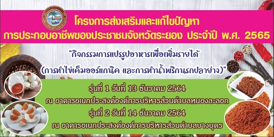 ขอเชิญเข้าร่วมโครงการส่งเสริมและแก้ไขปัญหาการประกอบอาชีพของประชาชนจ.ระยอง ประจำปีพ.ศ.2565"กิจกรรมการแปรรูปอาหารเพิ่อเพิ่มรายได้ (การทำไข่เค็มออร์แกนิคและการทำน้ำพริกนรกปลาย่าง)" 1 ธันวาคม 2564 551