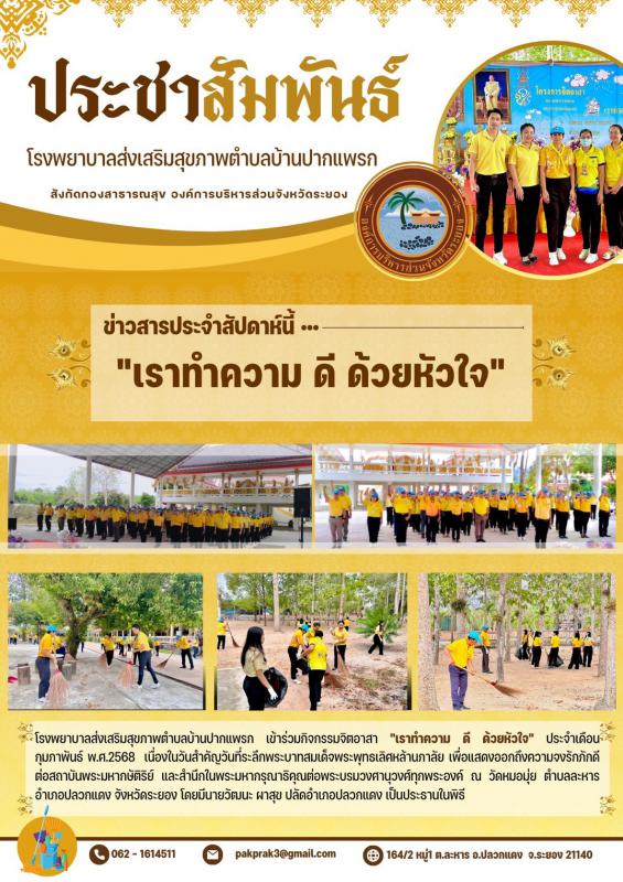 วันที่ 24 กุมภาพันธ์ 2568 รพ.สต.บ้านปากแพรก เข้าร่วมกิจกรรมจิตอาสา "เราทำความ ดี ด้วยหัวใจ" เนื่องในวันสำคัญวันที่ระลึกพระบาทสมเด็กพระพุทธเลิศหล้านภาลัย ณ วัดหมอมุ่ย ต.ละหาร อ.ปลวกแดง จ.ระยอง 11 มีนาคม 2568 577