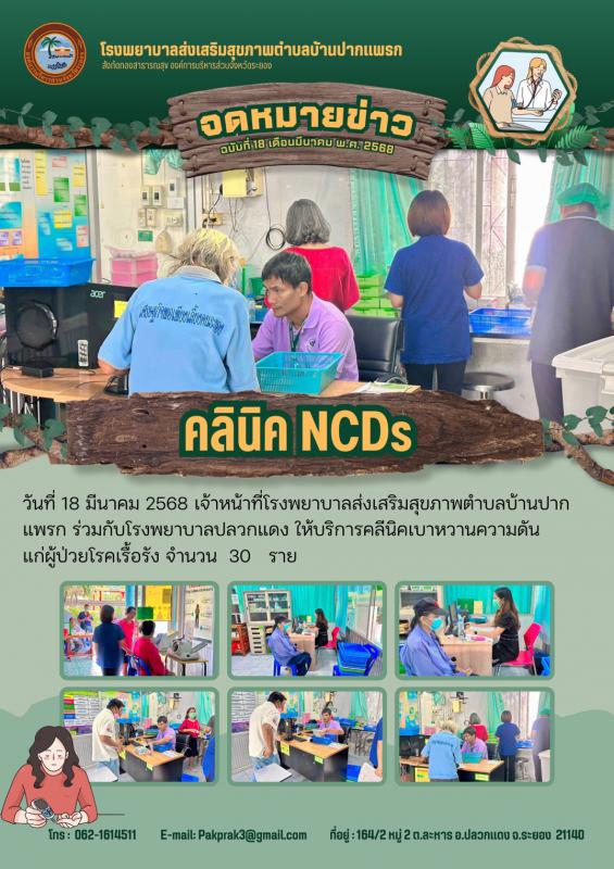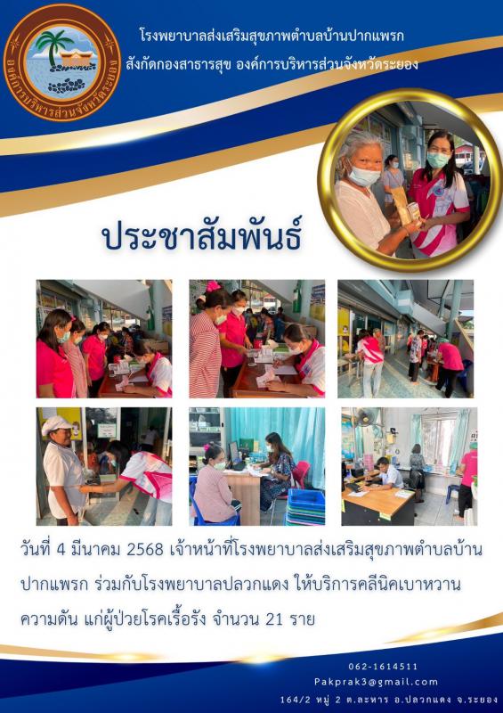 วันที่ 18 มีนาคม 2568 เจ้าหน้าที่ รพ.สต.บ้านปากแพรก ร่วมกับ รพ.ปลวกแดง ให้บริการคลินิกเบาหวาน / ความดัน แก่ผู้ป่วยโรคเรื้อรัง จำนวน 30 ราย 19 มีนาคม 2568 622