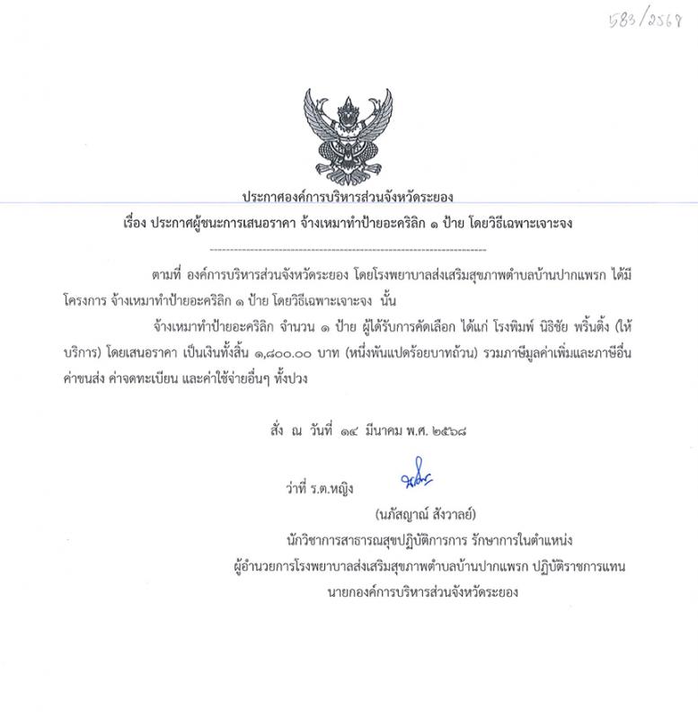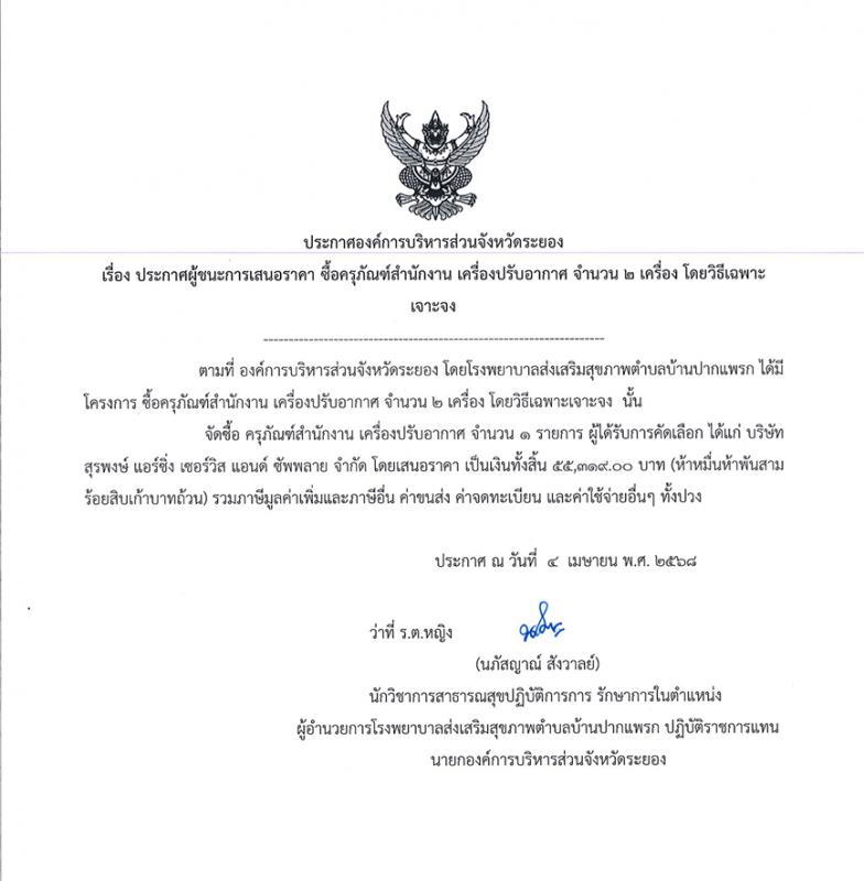 ประกาศผู้ชนะเสนอราคา ซื้อครุภัณฑ์สำนักงาน เครื่องปรับอากาศ จำนวน 2 เครื่อง โดยวิธีเฉพาะเจาะจง 4 เมษายน 2568 539