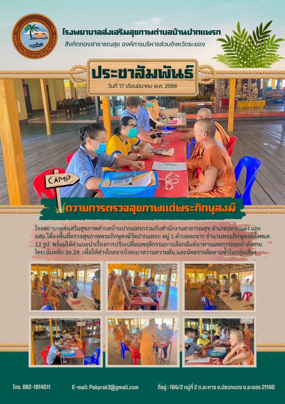 วันที่ 17 มีนาคม 2568 รพ.สต.บ้านปากแพรก ร่วมกับสาธารณสุขอำเภอปลวกแดง และ อสม.ได้ลงพื้นที่ตรวจสุขภาพพระภิกษุสงฆ์วัดปากแพรก ม.1 ต.ละหาร จำนวน 12 รูป พร้อมให้คำแนะนำเรื่องการปรับเปลี่ยนพฤติกรรมการเลือกฉันท์อาหารและการออกกำลังกายโดยเน้นหลัก 3อ. 2ส. 24 มีนาคม 2568 449