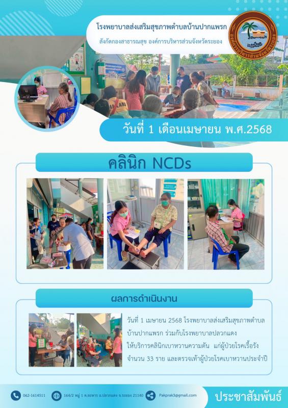 วันที่ 1 เมษายน 2568 รพ.สต.บ้านปากแพรก ร่วมกับ รพ.ปลวกแดง ให้บริการคลินิกเบาหวาน/ความดัน แก่ผู้ป่วยโรคเรื้อรัง จำนวน 33 ราย และตรวจเท้าผู้ป่วยโรคเบาหวานประจำปี 8 เมษายน 2568 451