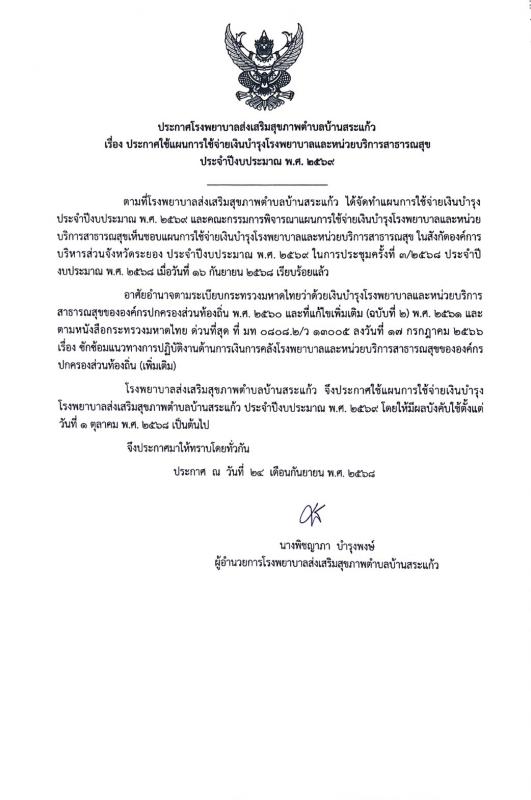 ประกาศโรงพยาบาลส่งเสริมสุขภาพตำบลบ้านสระแก้ว เรื่อง ประกาศใช้แผนการใช้จ่ายเงินบำรุงโรงพยาบาลและหน่วยบริการสาธารณสุข ประจำปีงบประมาณ พ.ศ. 2569 24 กันยายน 2568 120