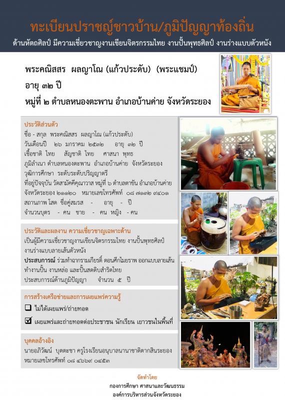 ทะเบียนปราชญ์ชาวบ้าน/ภูมิปัญญาท้องถิ่น ด้านศิลปกรรม ผู้มีความเชี่ยงชาญในด้านหัตถศิลป์ มีความเชี่ยวชาญงานเขียนจิตรกรรมไทย