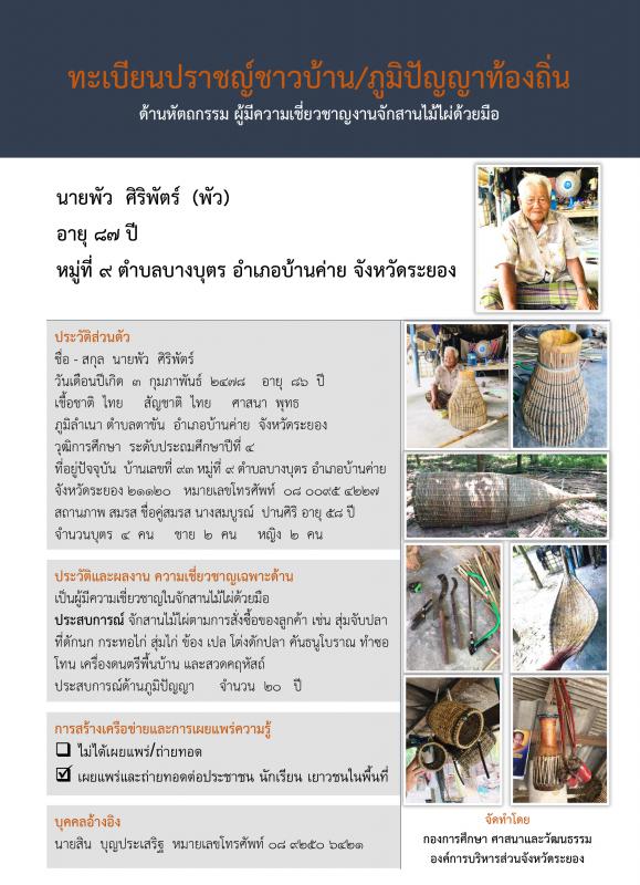 ทะเบียนปราชญ์ชาวบ้าน/ภูมิปัญญาท้องถิ่น ด้านหัตถกรรม ผู้มีความเชี่ยวชาญงานจักสานไม้ไผ่ด้วยมือ