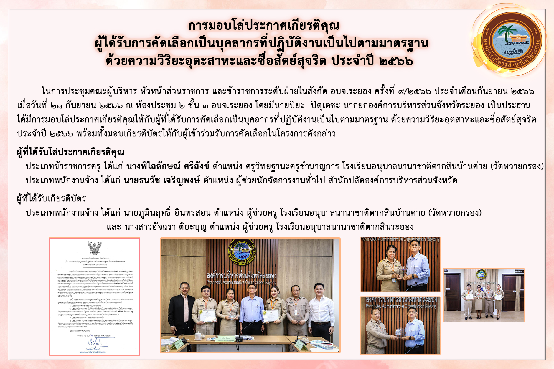 การมอบโล่ประกาศเกียรติคุณ ผู้ได้รับการคัดเลือกเป็นบุคลากรที่ปฏิบัติงานเป็นไปตามมาตรฐาน ด้วยความวิริยะอุตะสาหะและซื่อสัตย์สุจริต ประจำปี 2566