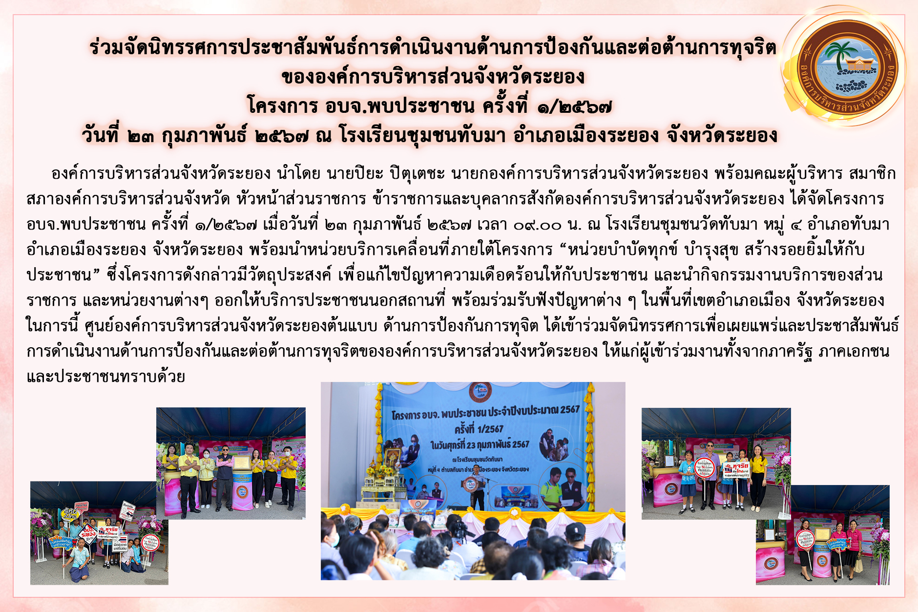 การประชาสัมพันธ์การดำเนินงานด้านการป้องกันและต่อต้านการทุจริต ของ อบจ.ระยอง โครงการ อบจ.พบประชาชน ประจำปีงบประมาณ 2567 ครั้งที่ 1/2567