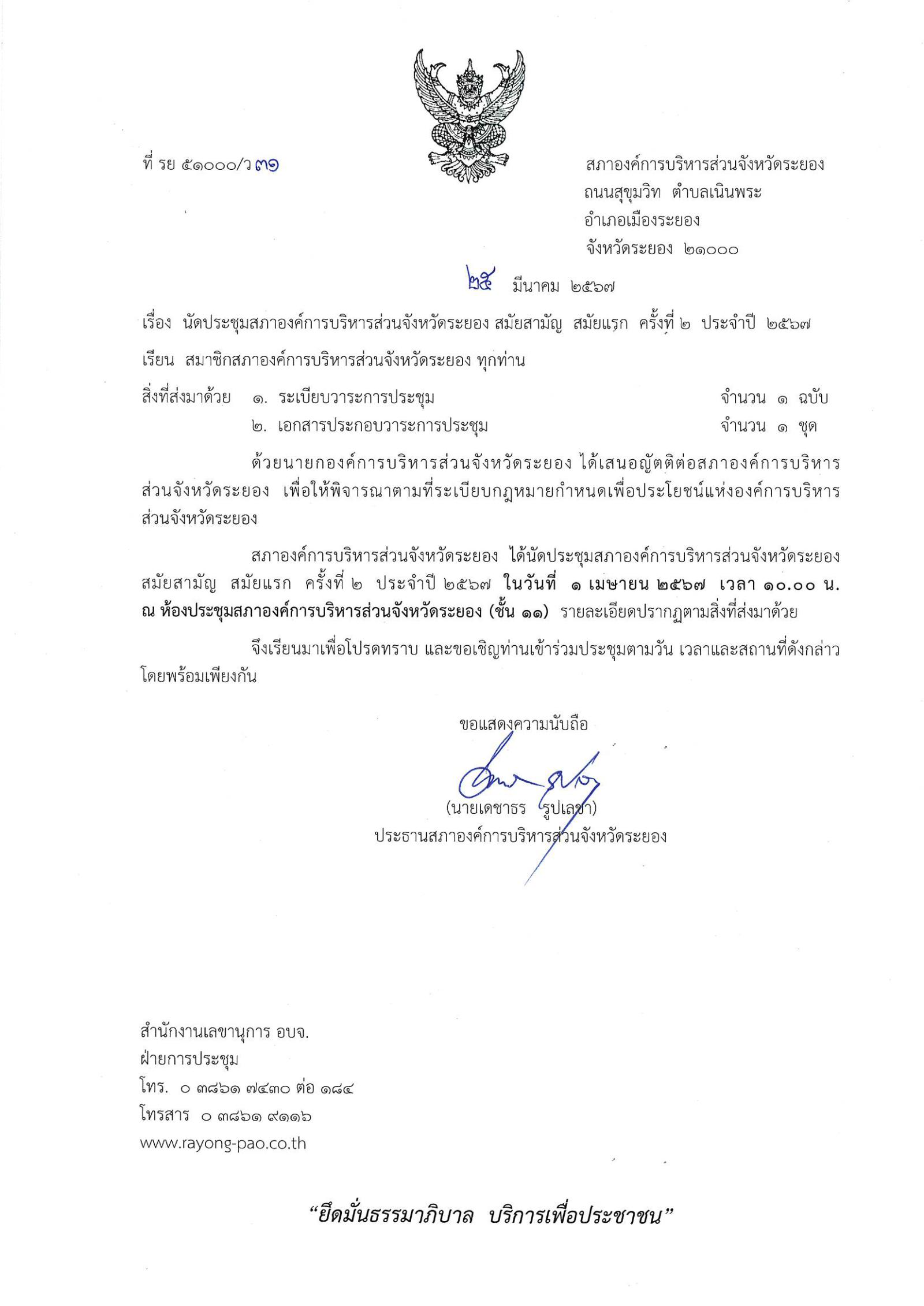 นัดประชุมสภาองค์การบริหารส่วนจังหวัดระยอง สมัยสามัญ สมัยแรก ครั้งที่ ๒ ประจำปี ๒๕๖๗