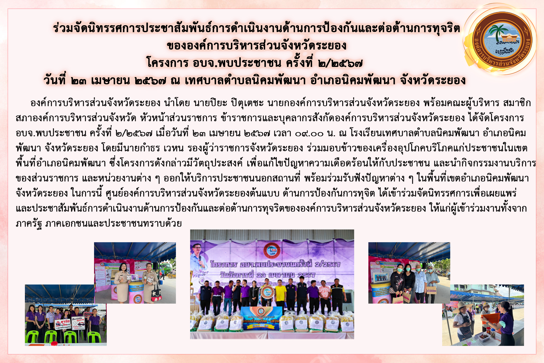 การประชาสัมพันธ์การดำเนินงานด้านการป้องกันและต่อต้านการทุจริต ของ อบจ.ระยอง โครงการ อบจ.พบประชาชน ประจำปีงบประมาณ 2567 ครั้งที่ 2/2567