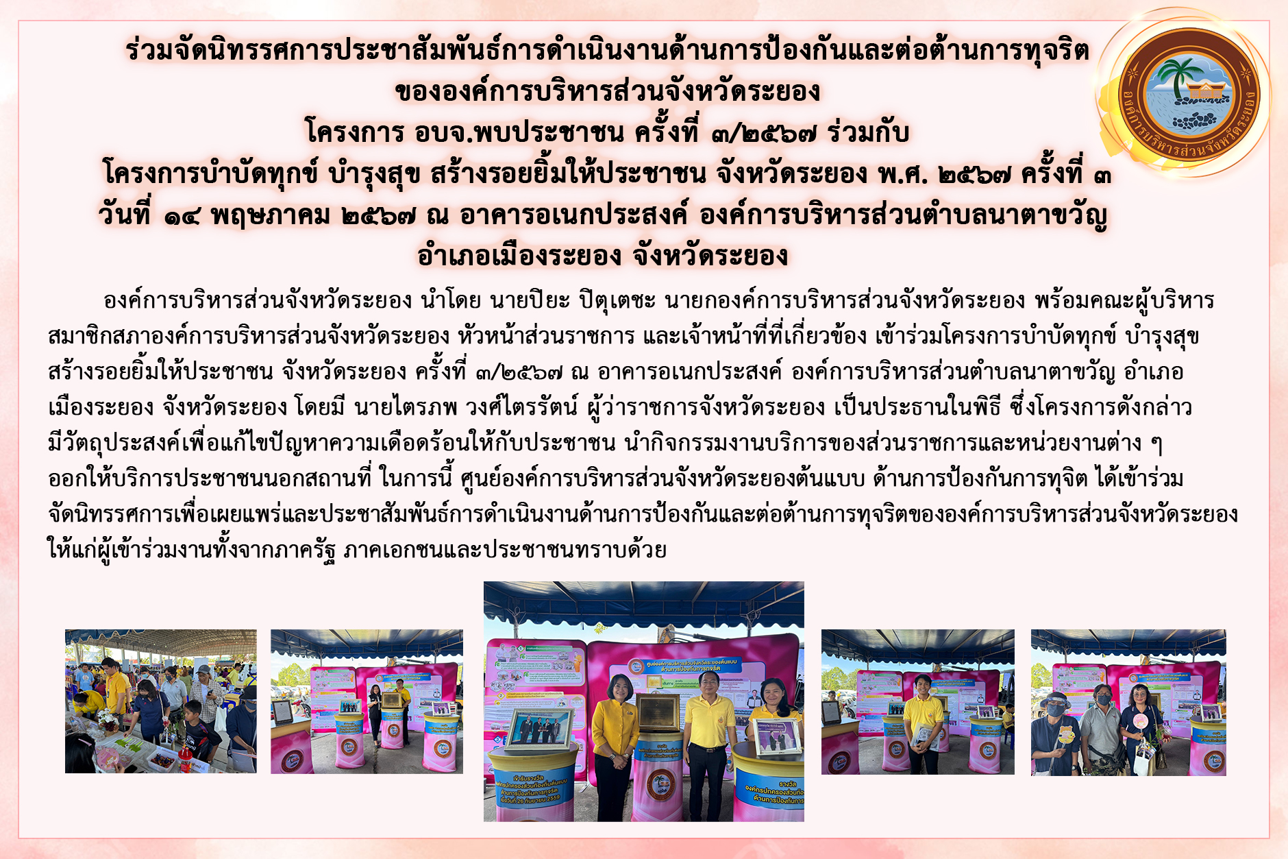 การประชาสัมพันธ์การดำเนินงานด้านการป้องกันและต่อต้านการทุจริต ของ อบจ.ระยอง โครงการ อบจ.พบประชาชน ครั้งที่ 3/2567 ร่วมกับ โครงการบำบัดทุกข์ บำรุงสุข สร้างรอยยิ้มให้ประชาชน จังหวัดระยอง พ.ศ. 2567 ครั้งที่ 3