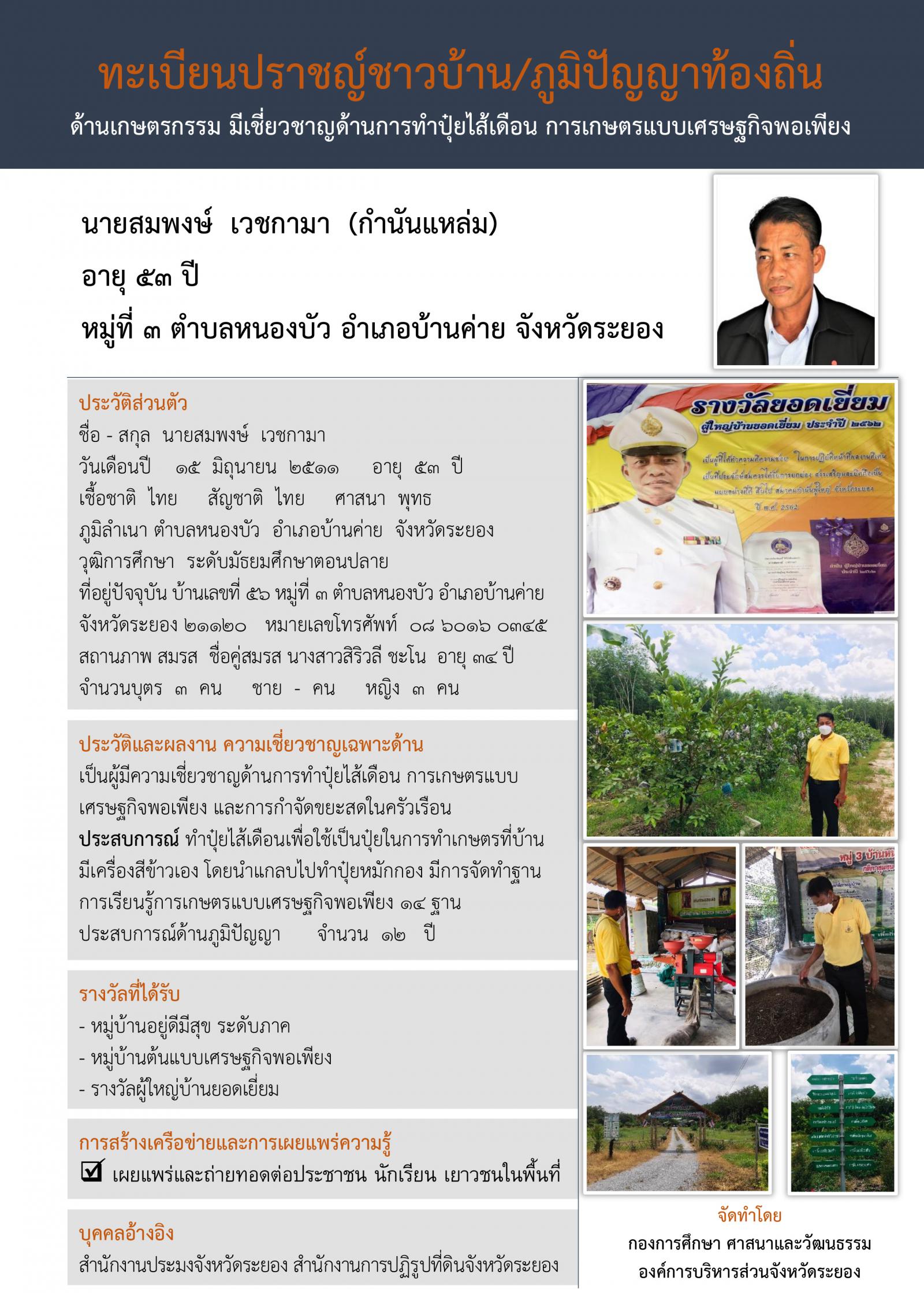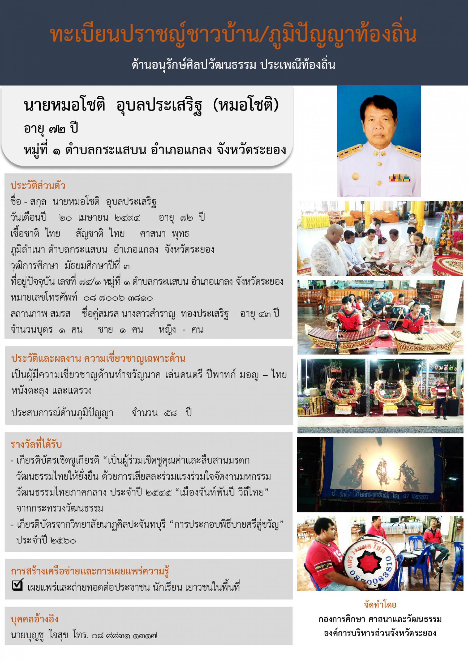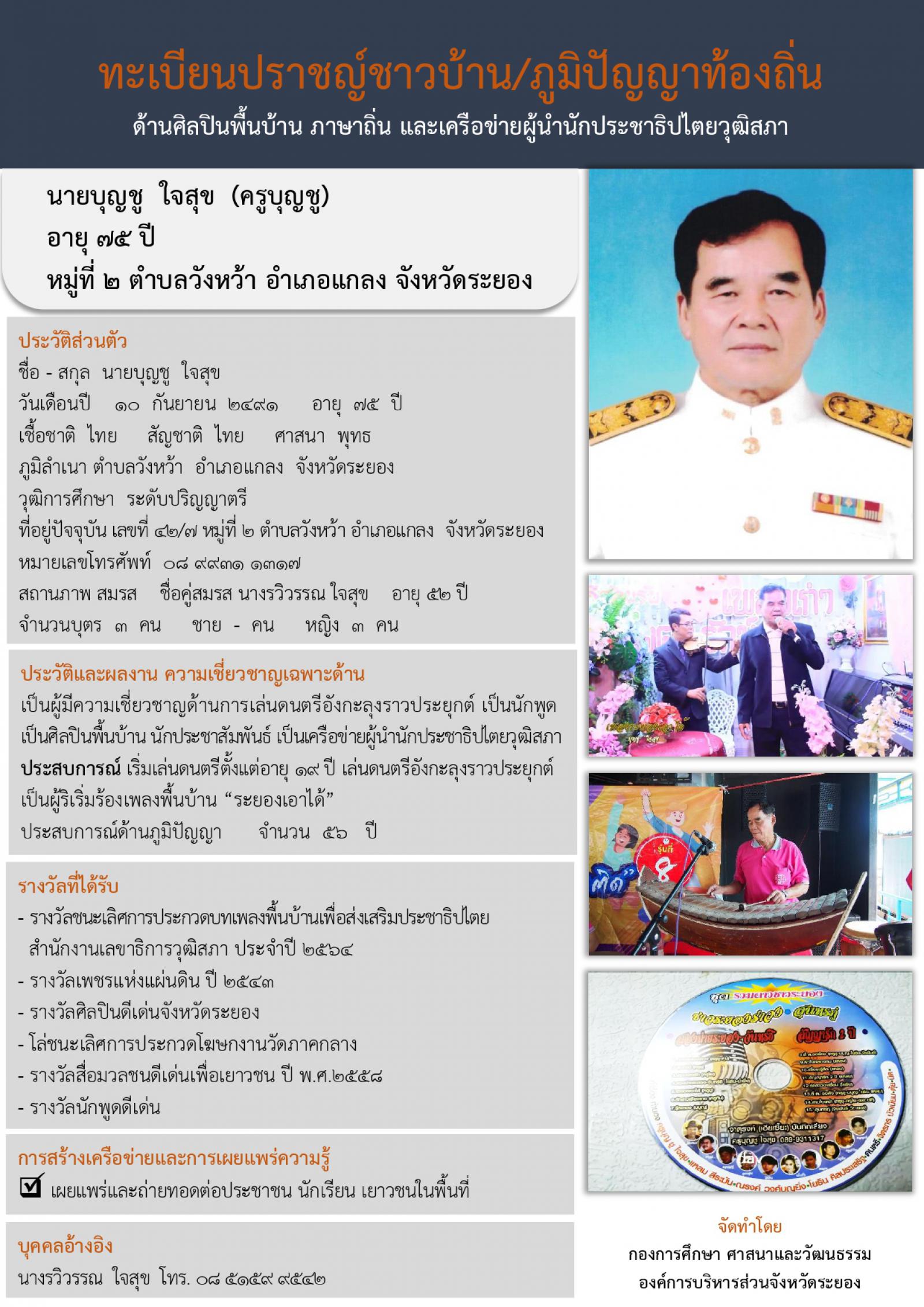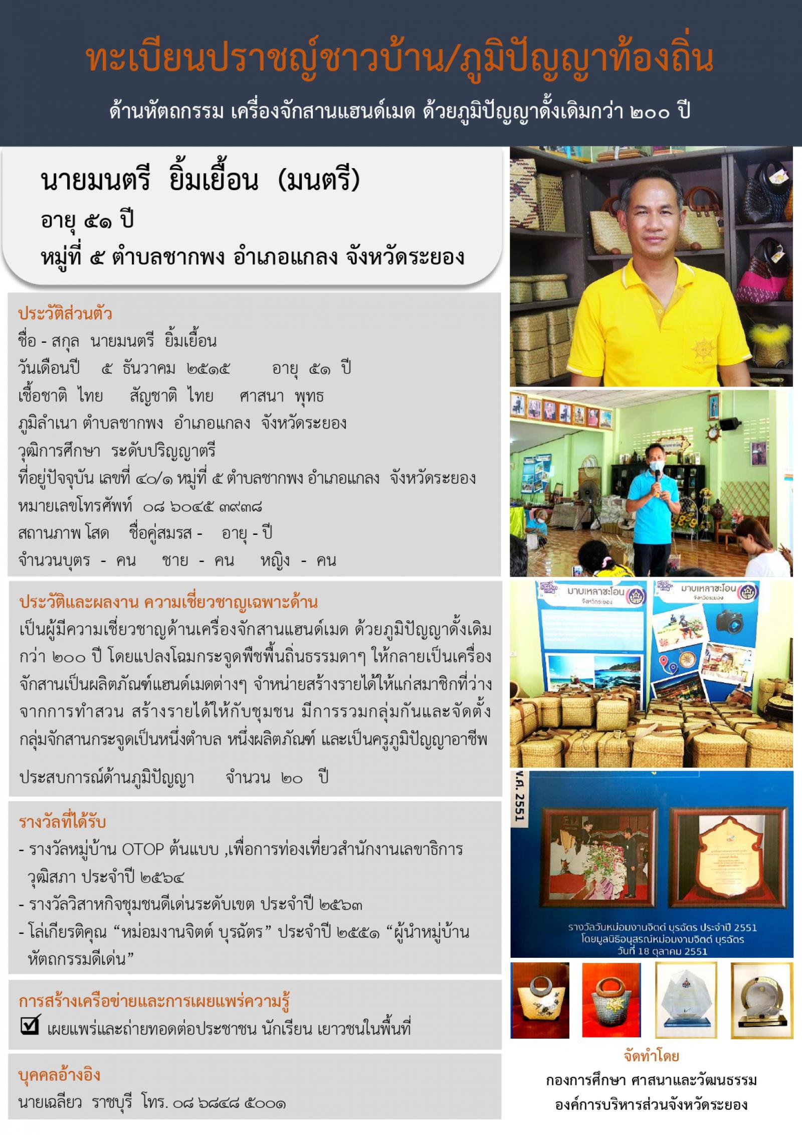 กองการศึกษา ศาสนาและวัฒนธรรม ได้จัดทำทะเบียนปราชญ์ชาวบ้าน/ภูมิปัญญาท้องถิ่นขึ้น เพื่อนำไปเผยแพร่ให้เกิดประโยชน์กับเด็ก เยาวชน ชุมชน ประชาชนในจังหวัดระยอง และประชาชนทั่วไป ได้ศึกษา เรียนรู้ต่อยอด สืบสาน อนุรักษ์ภูมิปัญญาท้องถิ่นที่สำคัญและมีประโยชน์ไว้ไม่ให้สูญหายไปจากจังหวัดระยอง