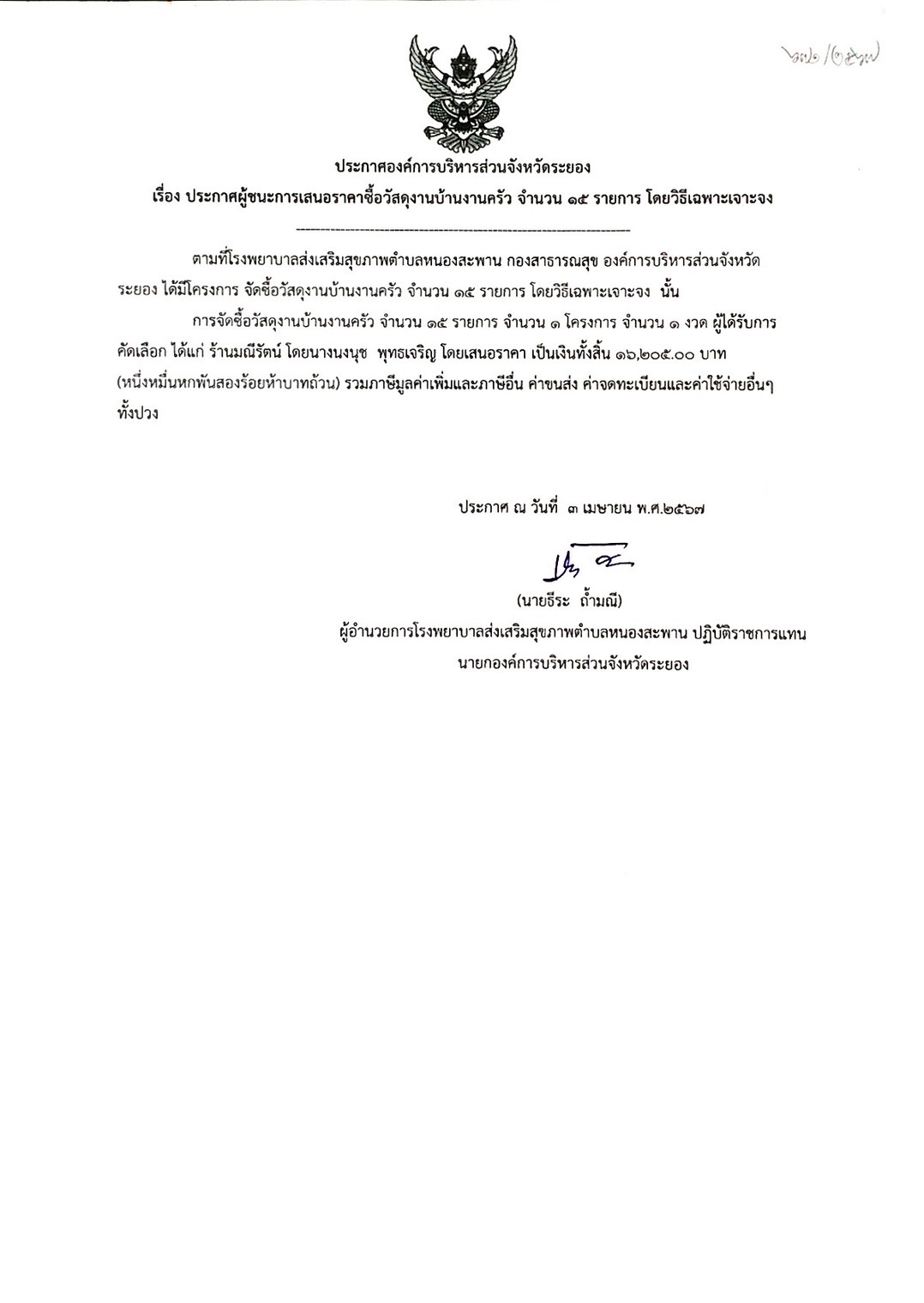 ประกาศผู้ชนะการเสนอราคาซื้อวัสดุงานบ้านงานครัว จำนวน 15 รายการ โดยวิธีเฉพาะเจาะจง