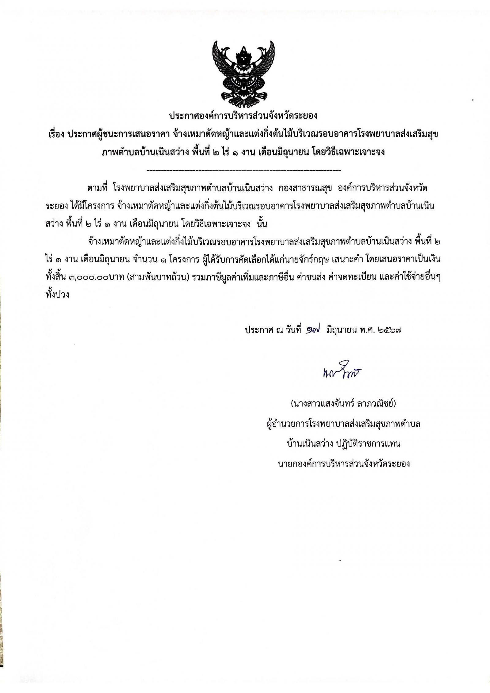 ประกาศผู้ชนะการเสนอราคา จ้างเหมาตัดหญ้าและแต่งกิ่งต้นไม้บริเวณรอบอาคาร รพ.สต.บ้านเนินสว่างฯ
