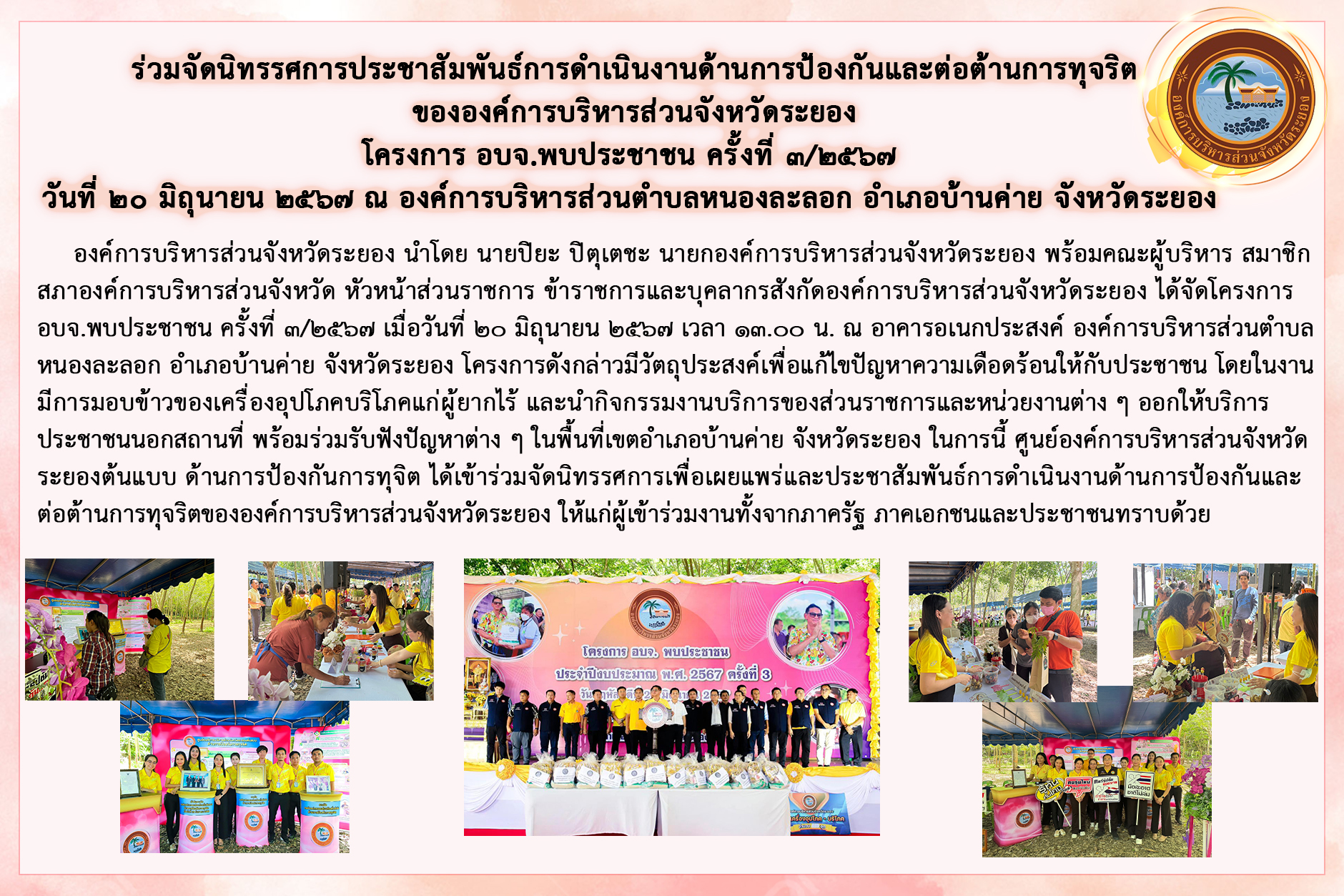 การประชาสัมพันธ์การดำเนินงานด้านการป้องกันและต่อต้านการทุจริต ของ อบจ.ระยอง โครงการ อบจ.พบประชาชน ประจำปีงบประมาณ 2567 ครั้งที่ 3/2567