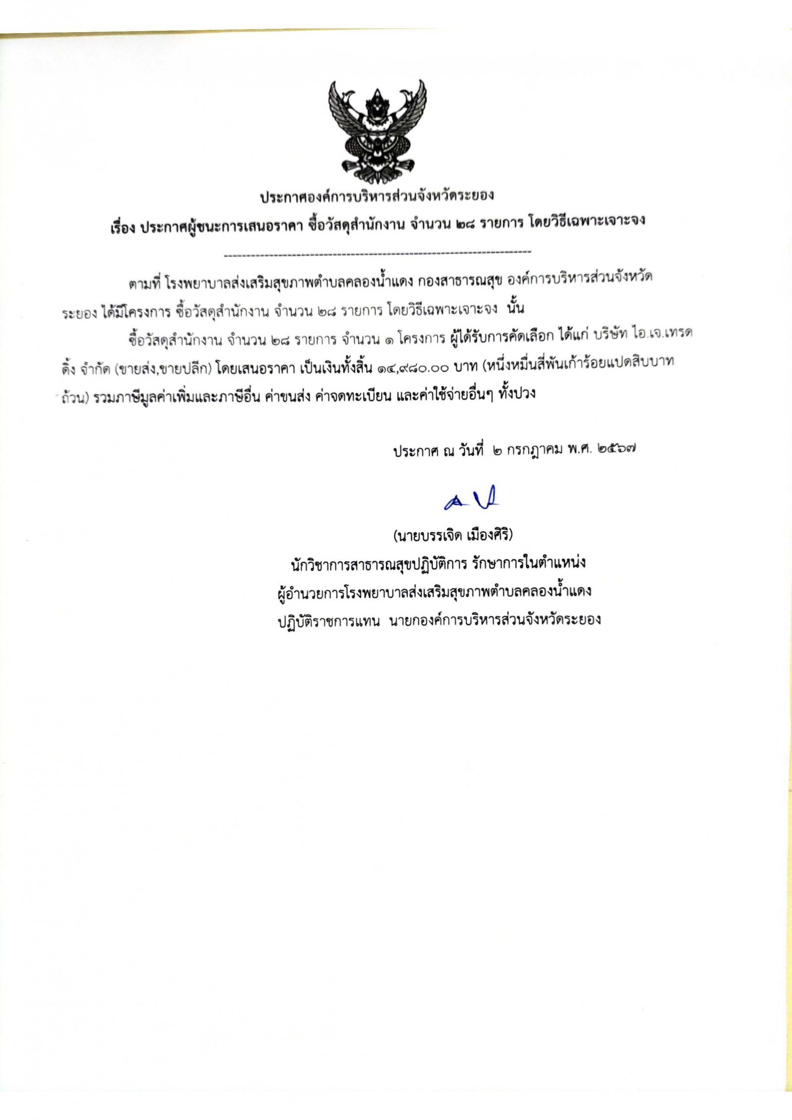 ประกาศผู้ชนะการเสนอราคา ซื้อวัสดุสำนักงาน จำนวน 28 รายการ โดยวิธีเฉพาะเจาะจง