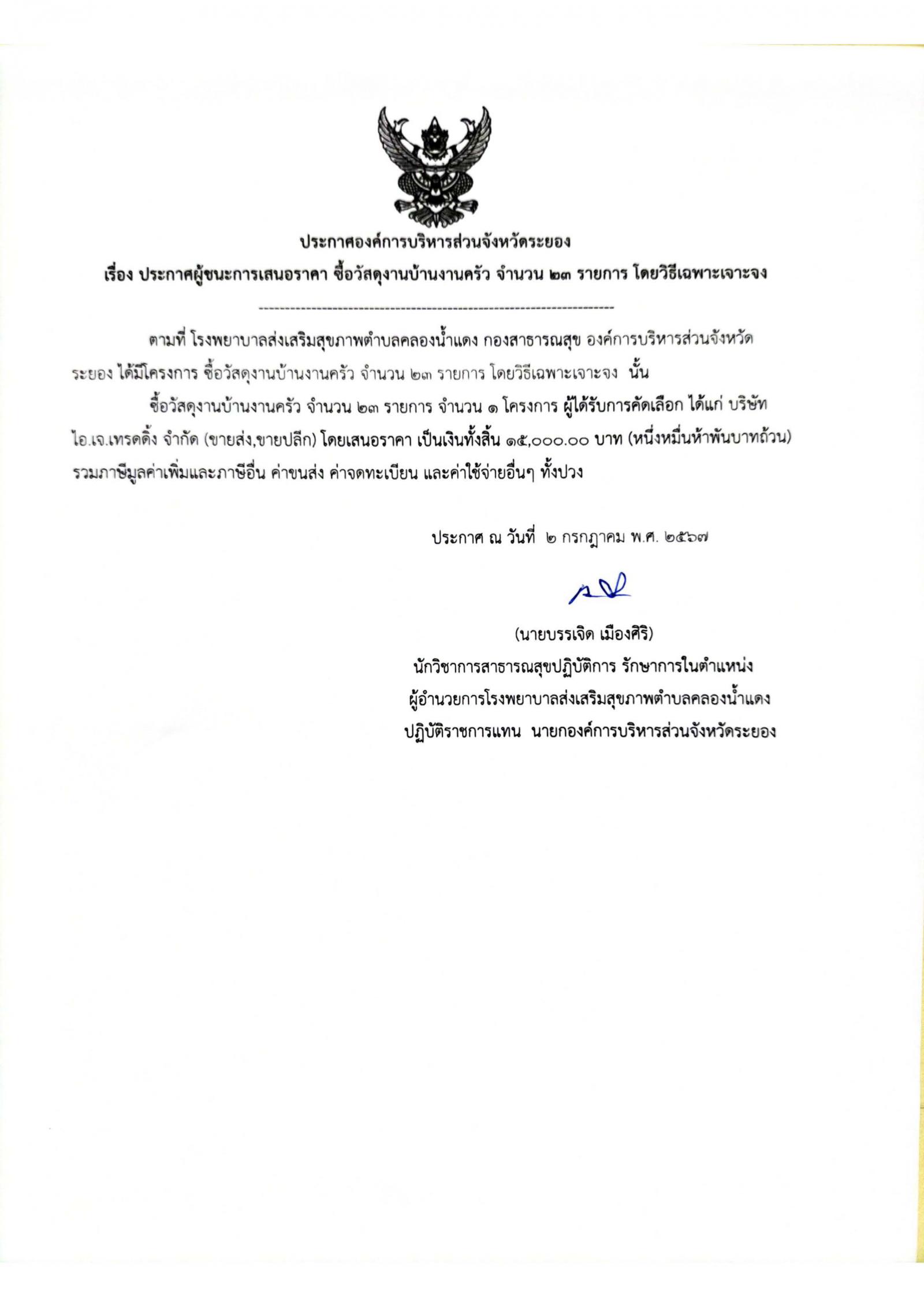 ประกาศผู้ชนะการเสนอราคา ซื้อวัสดุงานบ้านงานครัว จำนวน 23 รายการ โดยวิธีเฉพาะเจาะจง