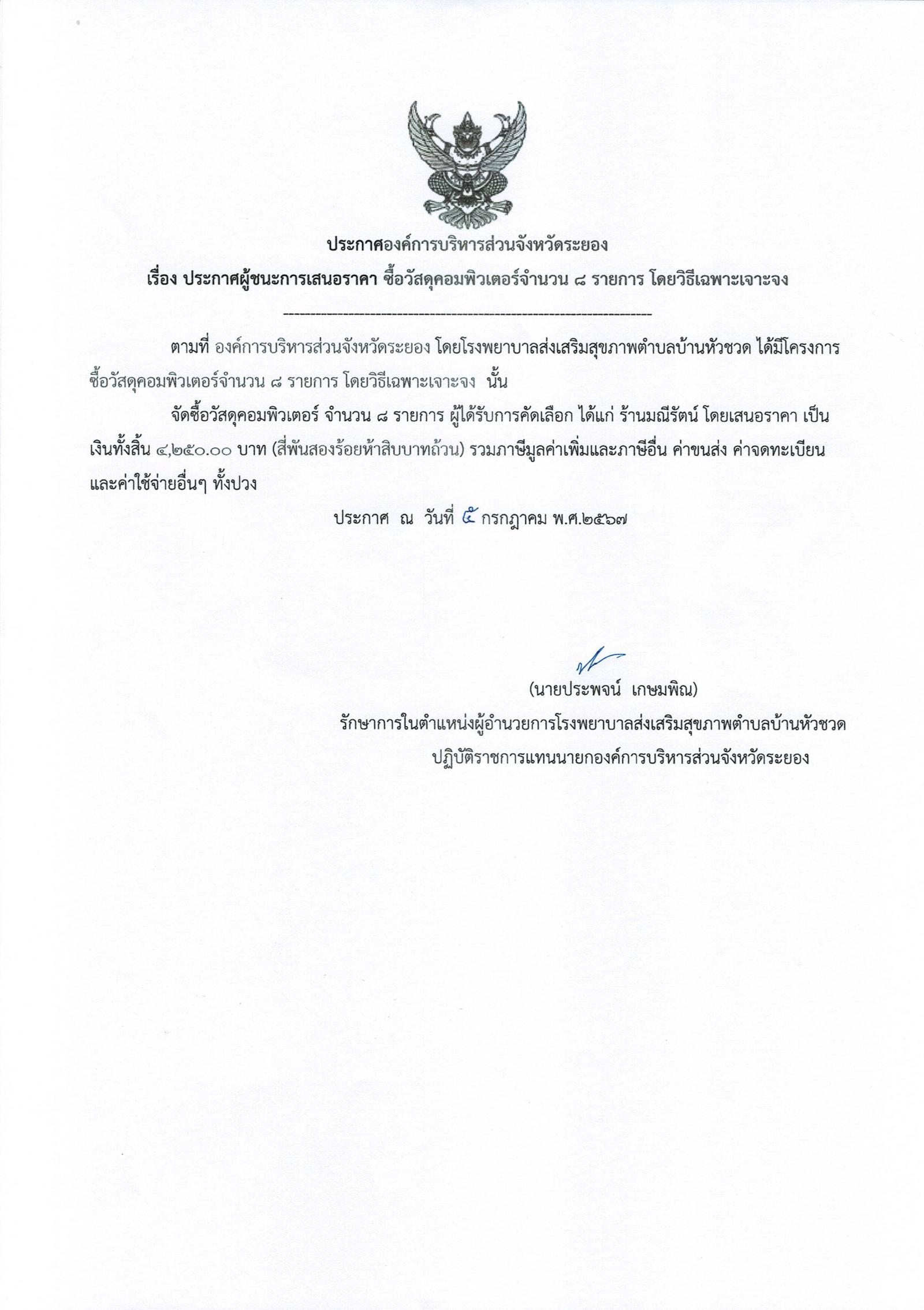 ประกาศผู้ชนะการเสนอราคา ซื้อวัสดุคอมพิวเตอร์จำนวน 8 รายการ โดยวิธีเฉพาะเจาะจง