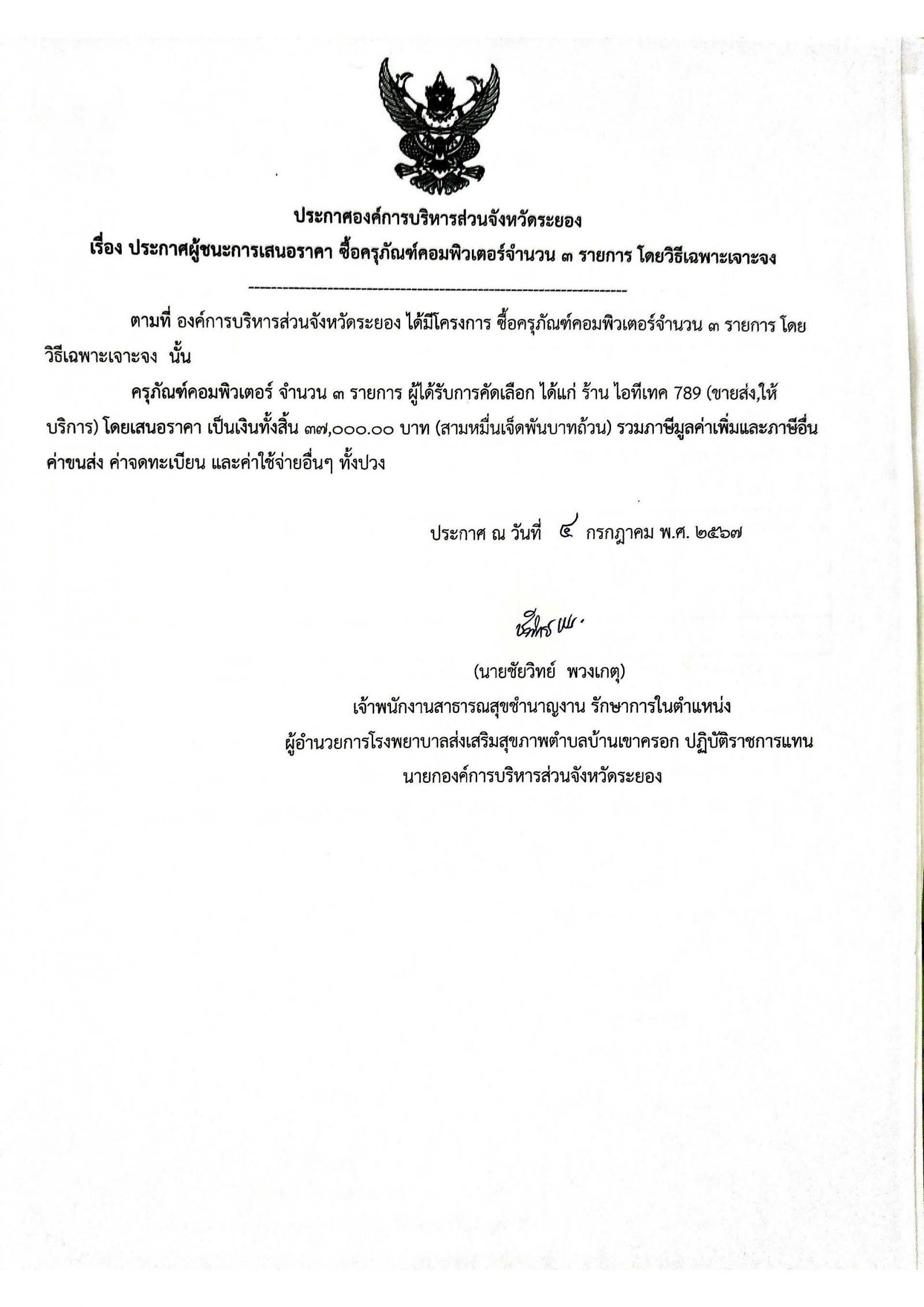 ประกาศผู้ชนะการเสนอราคา ซื้อครุภัณฑ์คอมพิวเตอร์จำนวน 3 รายการ โดยวิธีเฉพาะเจาะจง