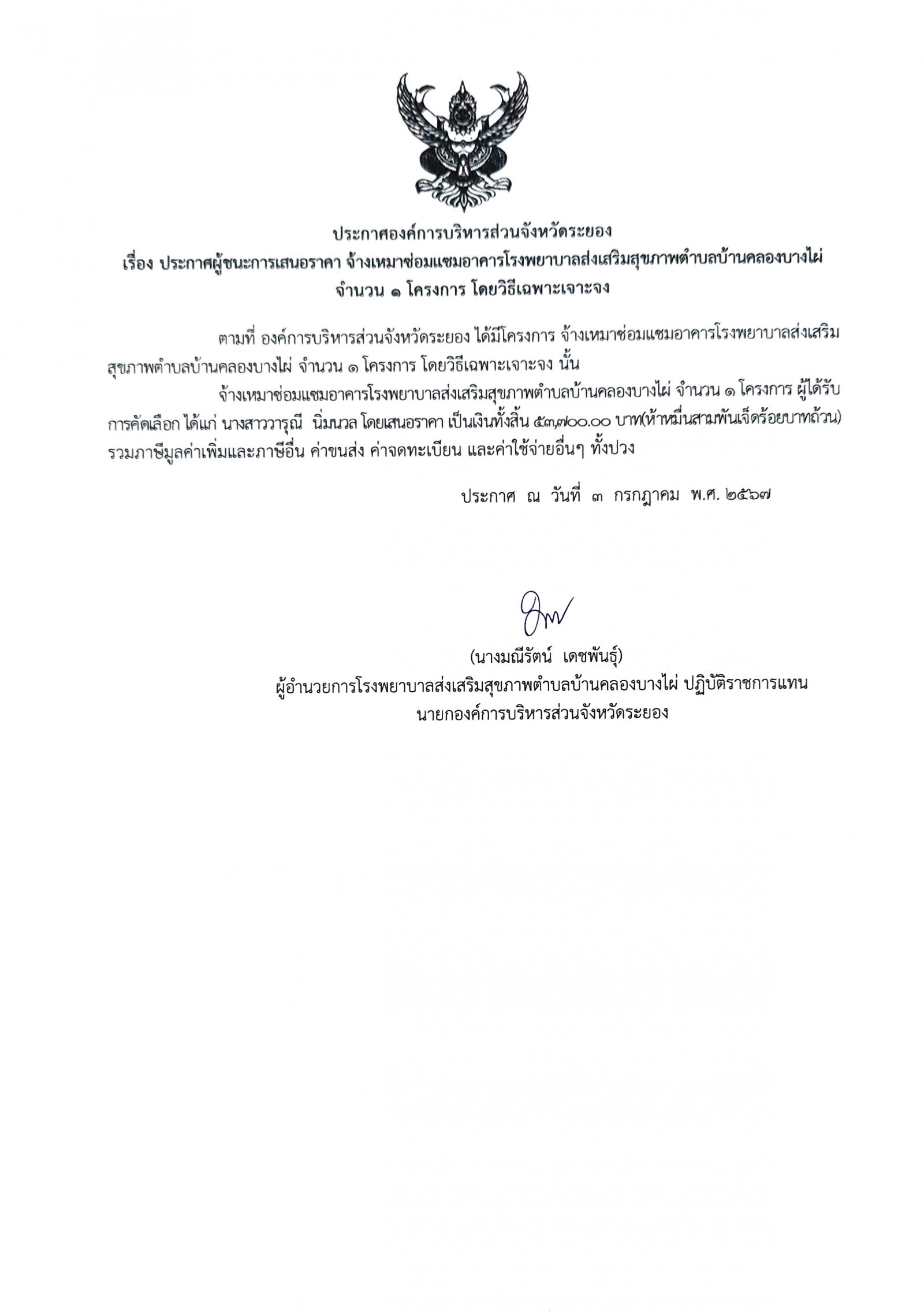 ประกาศผู้ชนะการเสนอราคา จ้างเหมาซ่อมแซมอาคารโรงพยาบาลส่งเสริมสุขภาพตำบลบ้านคลองบางไผ่ จำนวน 1 โครงการ โดยวิธีเฉพาะเจาะจง