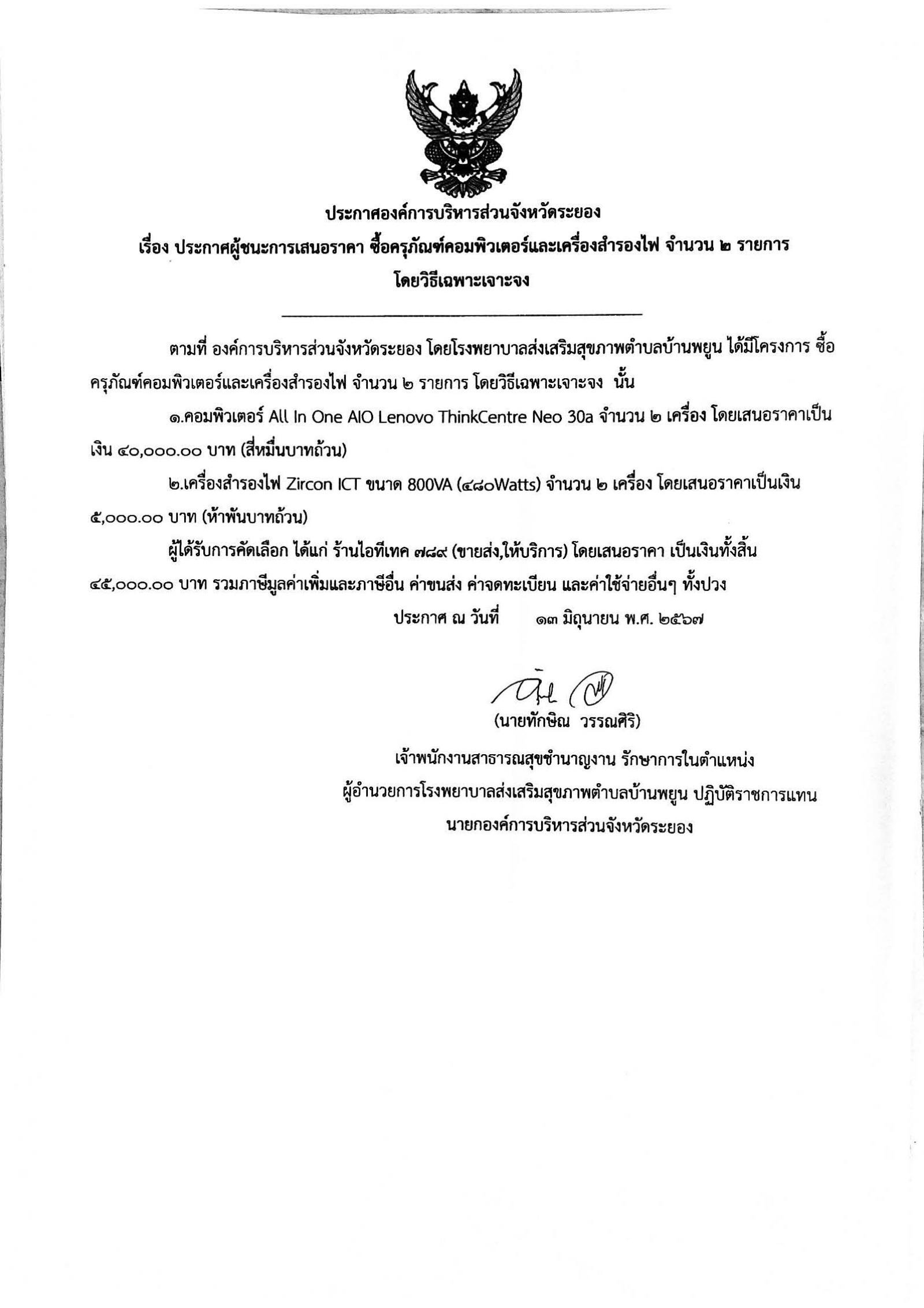 ประกาศผู้ชนะการเสนอราคา ซื้อครุภัณฑ์คอมพิวเตอร์และเครื่องสำรองไฟ จำนวน 2 รายการ