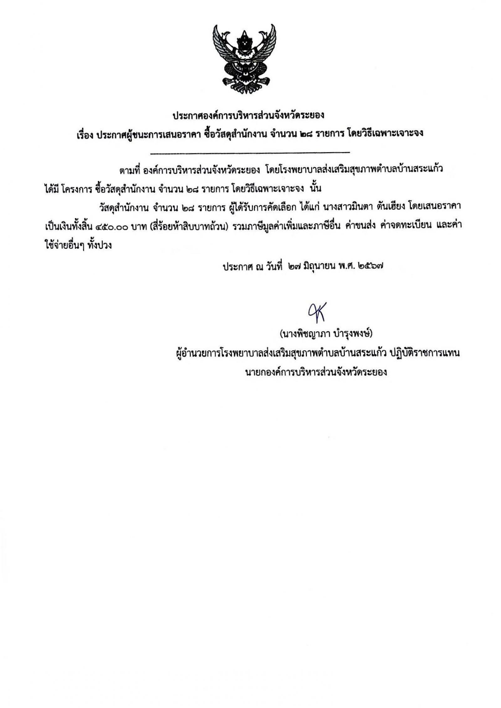 ประการผู้ชนะการเสนอราคา ซื้อวัสดุสำนักงาน จำนวน 28 รายการ โดยวิธีเฉพาะเจาะจง