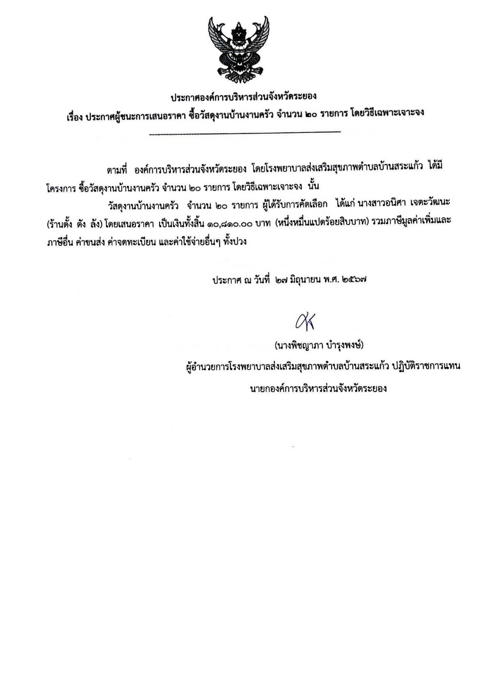 ประกาศผู้ชนะการเสนอราคา ซื้อวัสดุงานบ้านงานครัว จำนวน 20 รายการ โดยวิธีเฉพาะเจาะจง