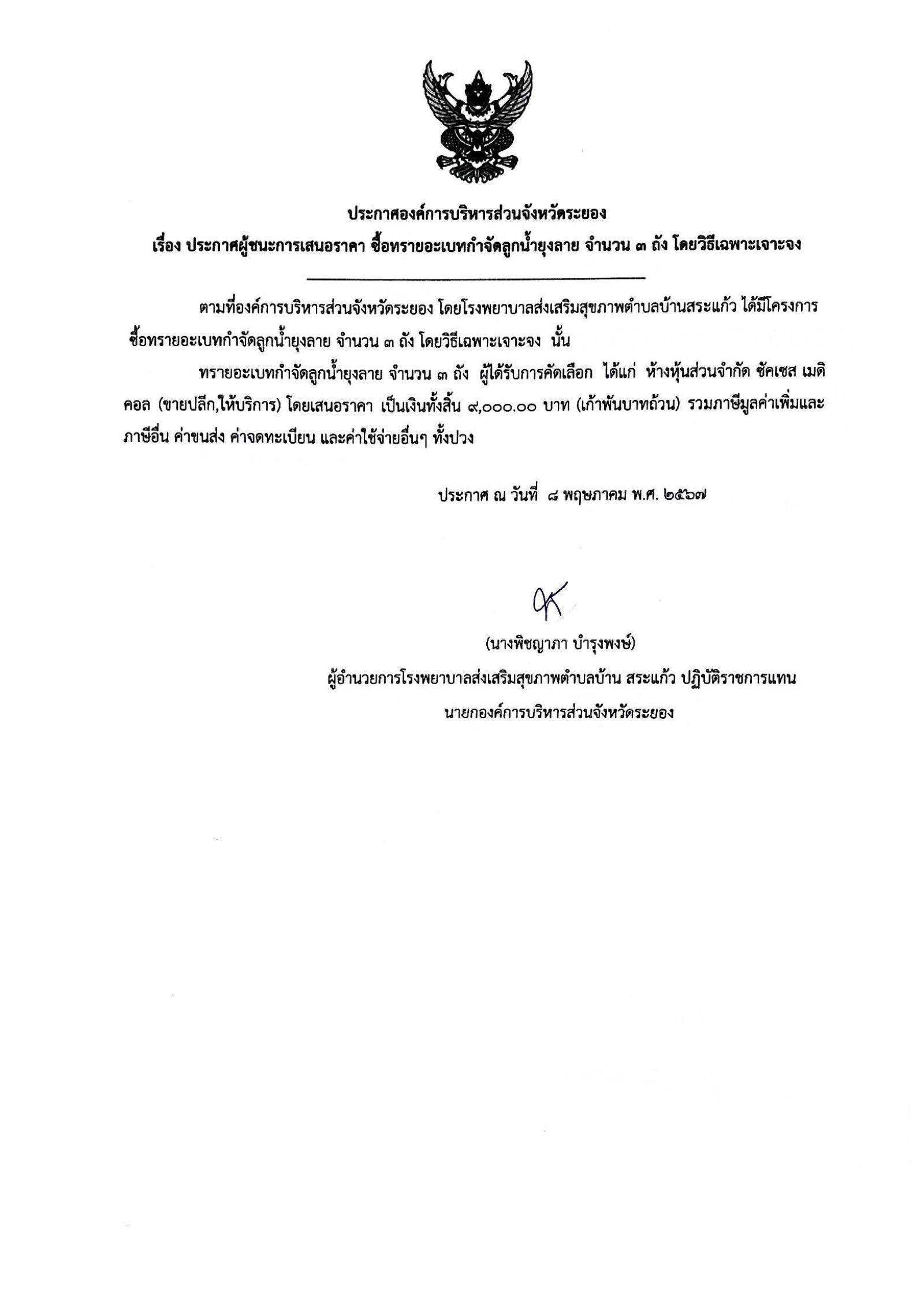 ประกาศผู้ชนะการเสนอราคา ซื้อทรายอะเบทกำจัดลูกน้ำยุงลาย จำนวน 3 ถัง โดยวิธีเฉพาะเจาะจง