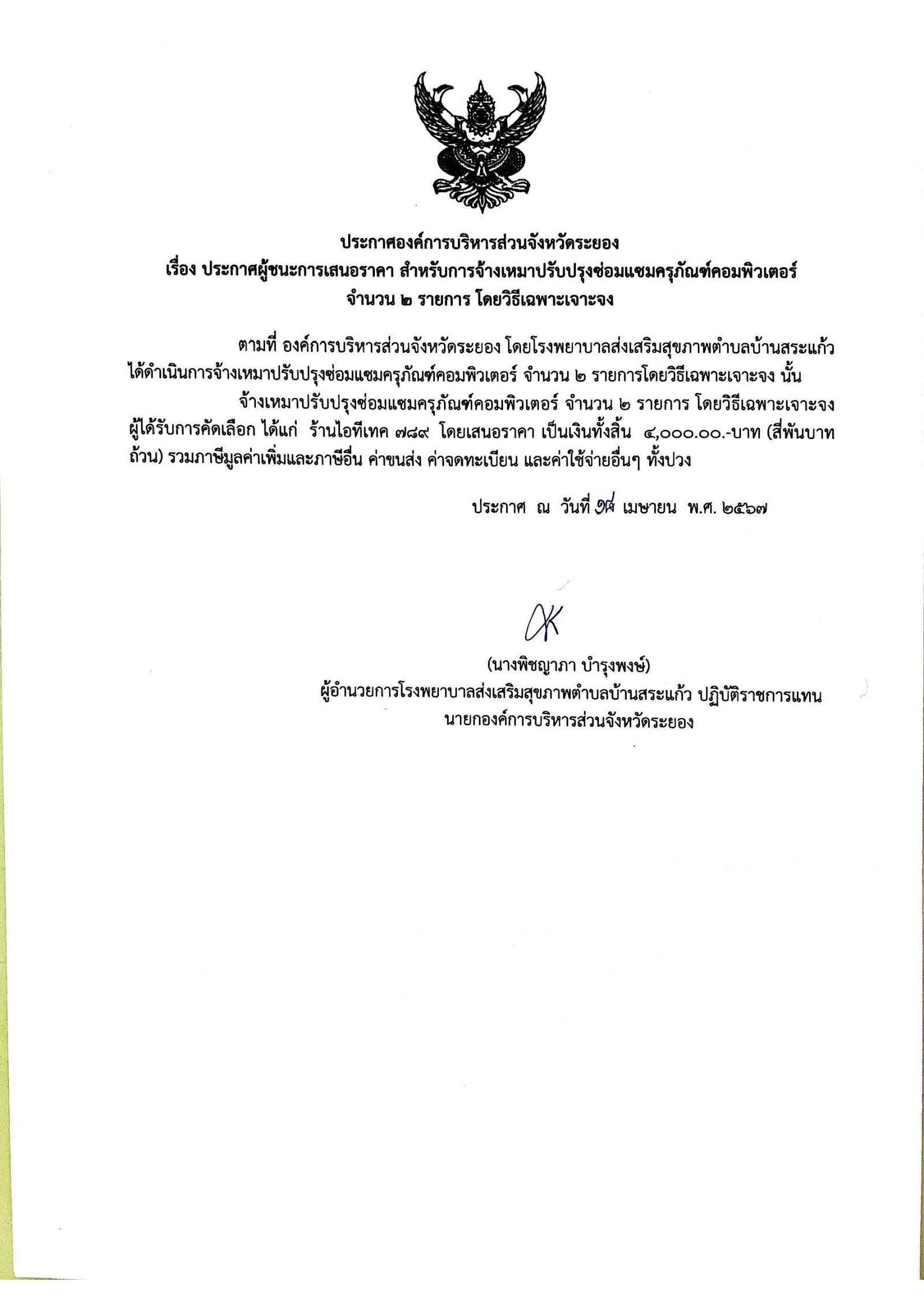 ประกาศผู้ชนะการเสนอราคา สำหรับการจ้างเหมาปรับปรุงซ่อมแซมครุภัณฑ์คอมพิวเตอร์ จำนวน 2 รายการ โดยวิธีเฉพาะเจาะจง