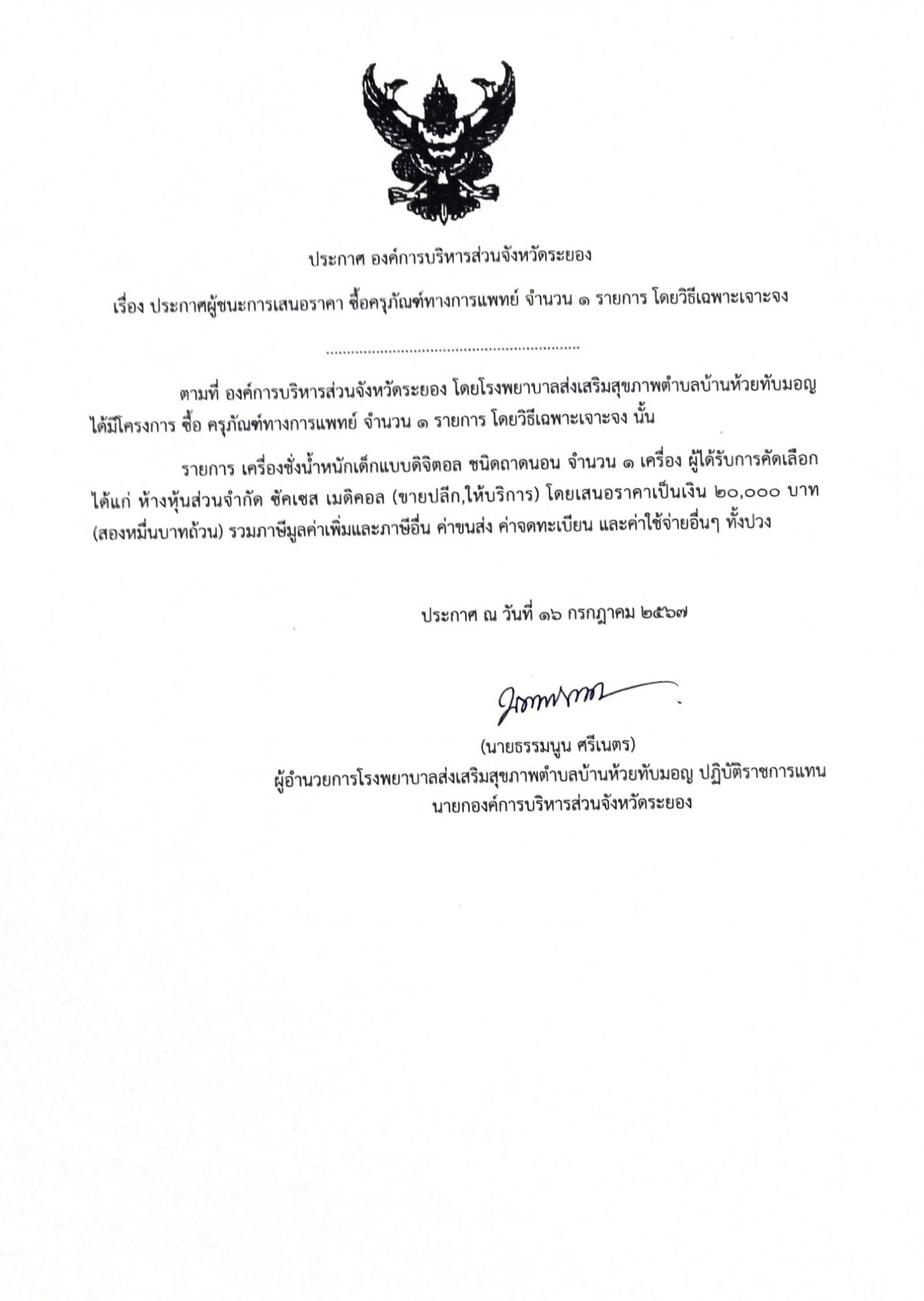 ประกาศผู้ชนะการเสนอราคา ซื้อครุภัณฑ์ทางการแพทย์ จำนวน 1 รายการ โดยวิธีเฉพาะเจาะจง