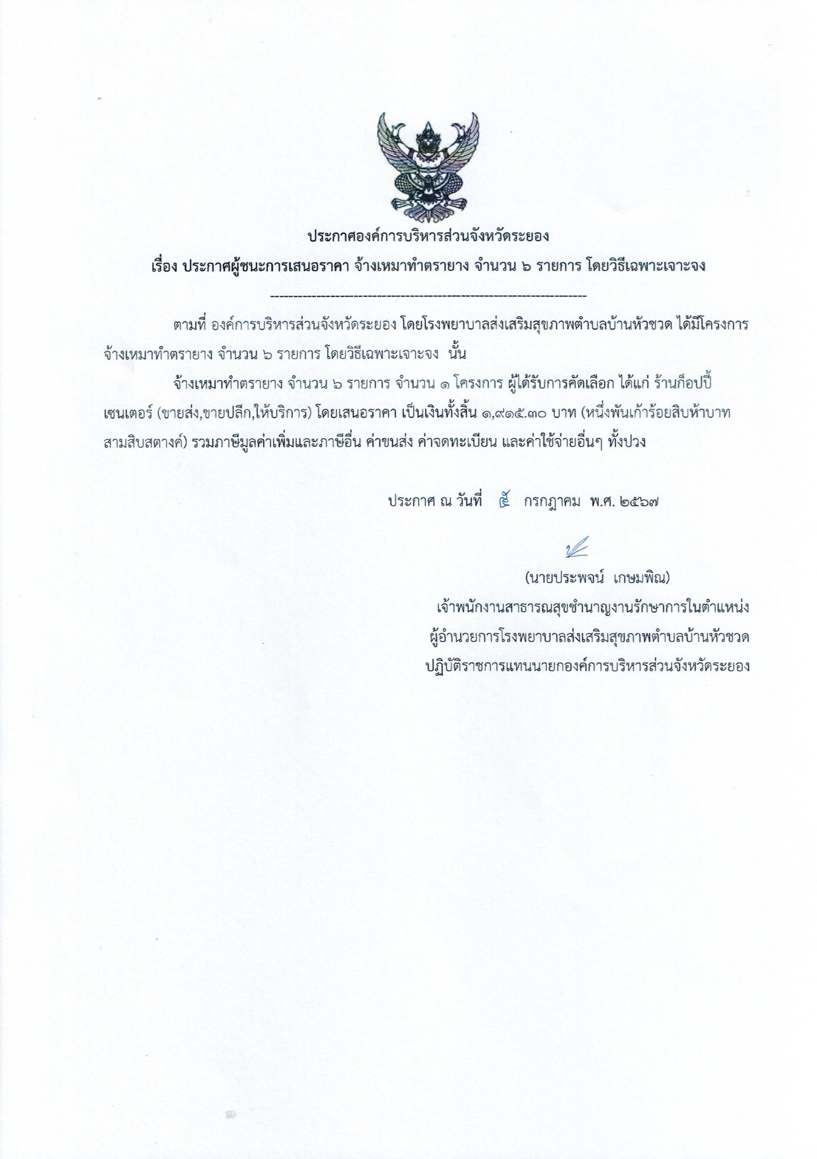 ประกาศผู้ชนะการเสนอราคา จ้างเหมาทำตรายาง จำนวน 6 รายการ โดยวิธีเฉพาะเจาะจง