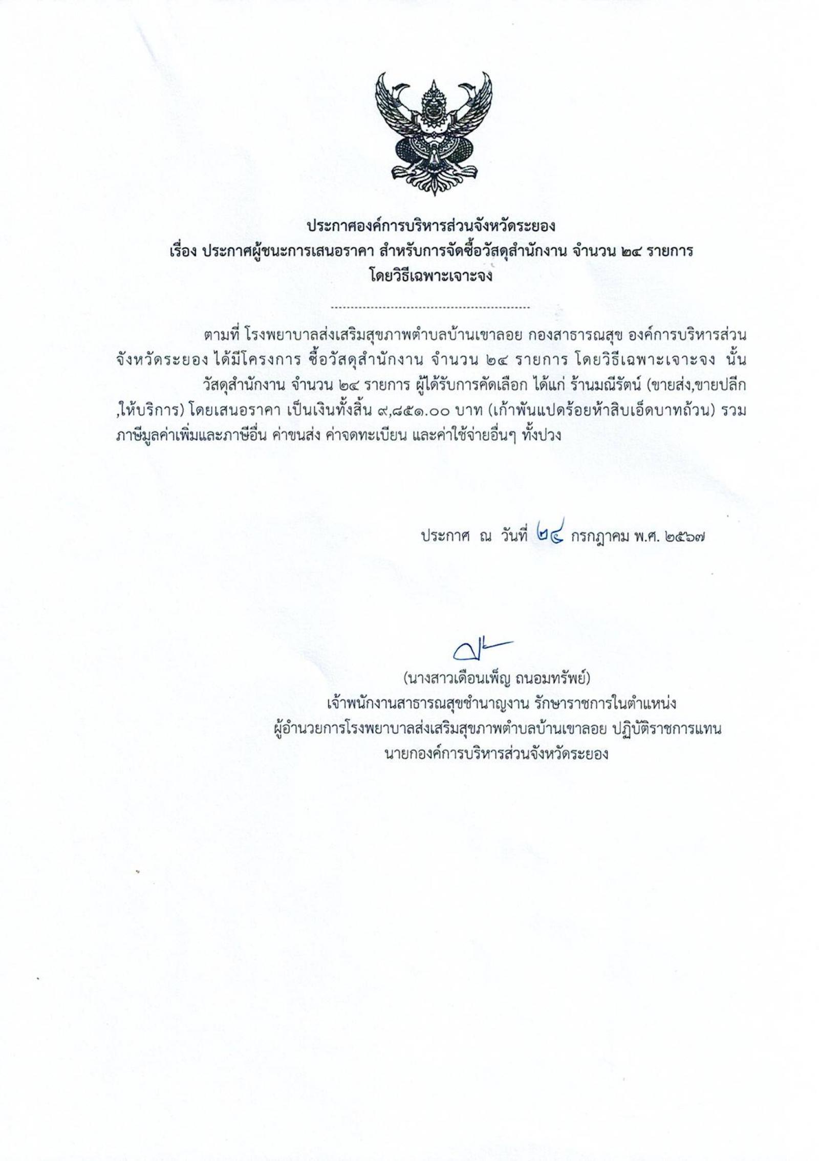 ประกาศผู้ชนะการเสนอราคา สำหรับการจัดซื้อวัสดุสำนักงาน จำนวน 24 รายการ โดยวิธีเฉพาะเจาะจง