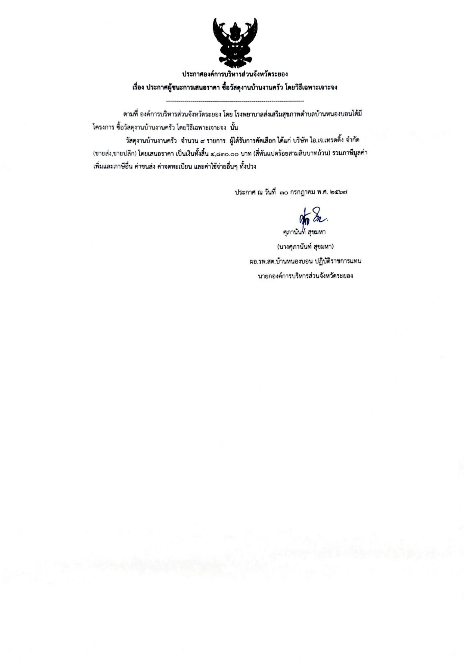 ประกาศผู้ชนะการเสนอราคา ซื้อวัสดุงานบ้านงานครัว โดยวิธีเฉพาะเจาะจง