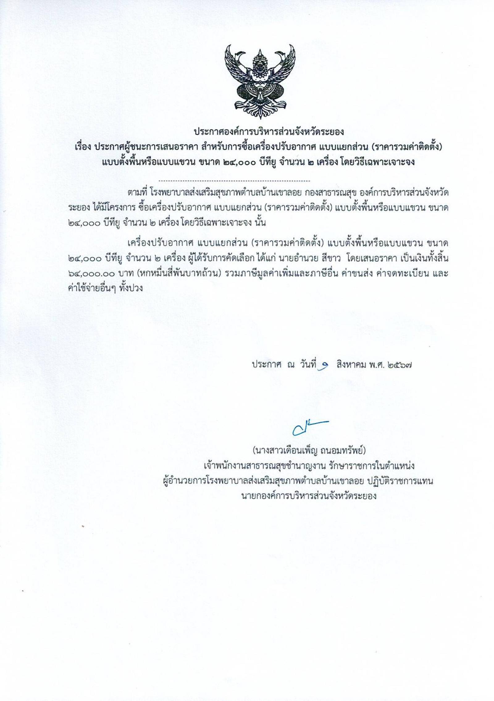 ประกาศผู้ชนะการเสนอราคา สำหรับการซื้อเครื่องปรับอากาศ แบบแยกส่วน (ราคารวมค่าติดตั้ง) แบบตั้งพื้นหรือแบบแขวน ขนาด 24,000 บีทียู จำนวน 2 เครื่อง โดยวิธีเฉพาะเจาะจง