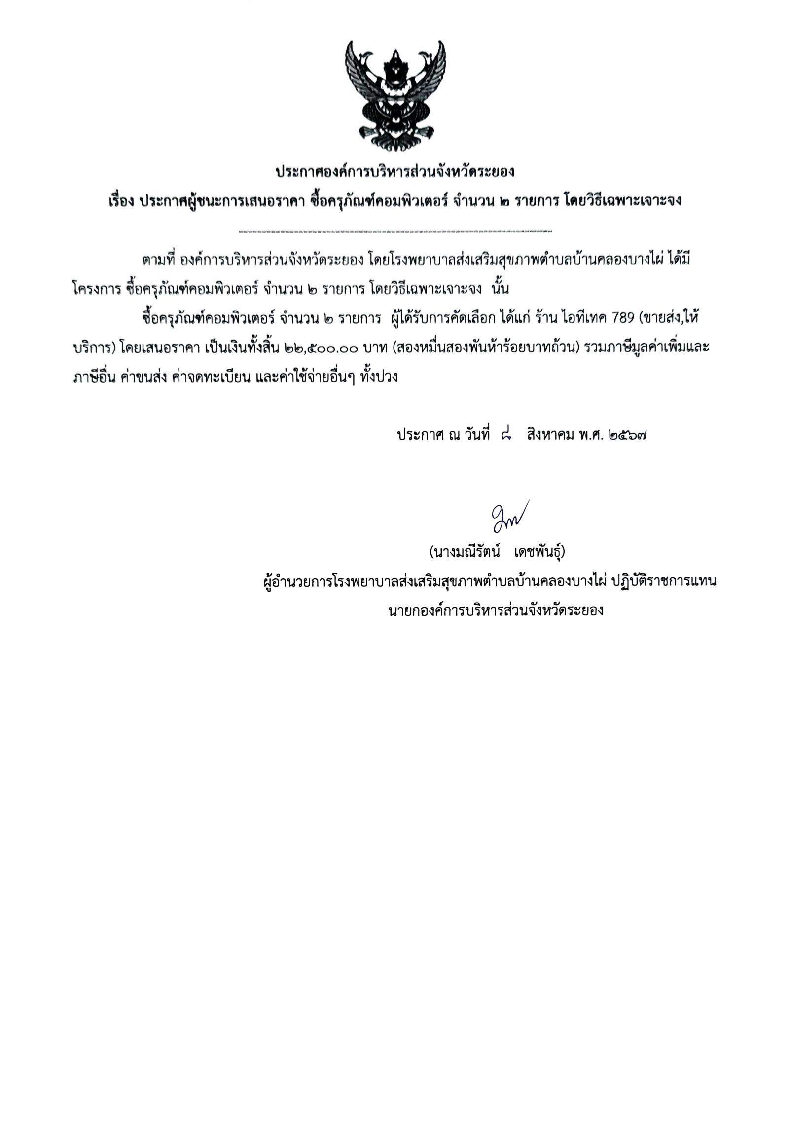 ประกาศผู้ชนะการเสนอราคา ซื้อครุภัณฑ์คอมพิวเตอร์ จำนวน 2 รายการ โดยวิธีเฉพาะเจาะจง