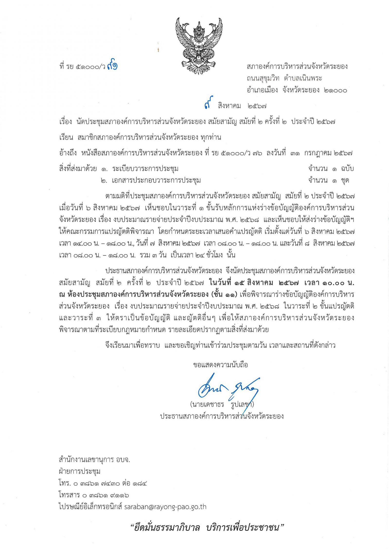 หนังสือนัดประชุมสภาองค์การบริหารส่วนจังหวัดระยอง สมัยสามัญ สมัยที่ 2 ครั้งที่ 2 ประจำปี 2567.pdf