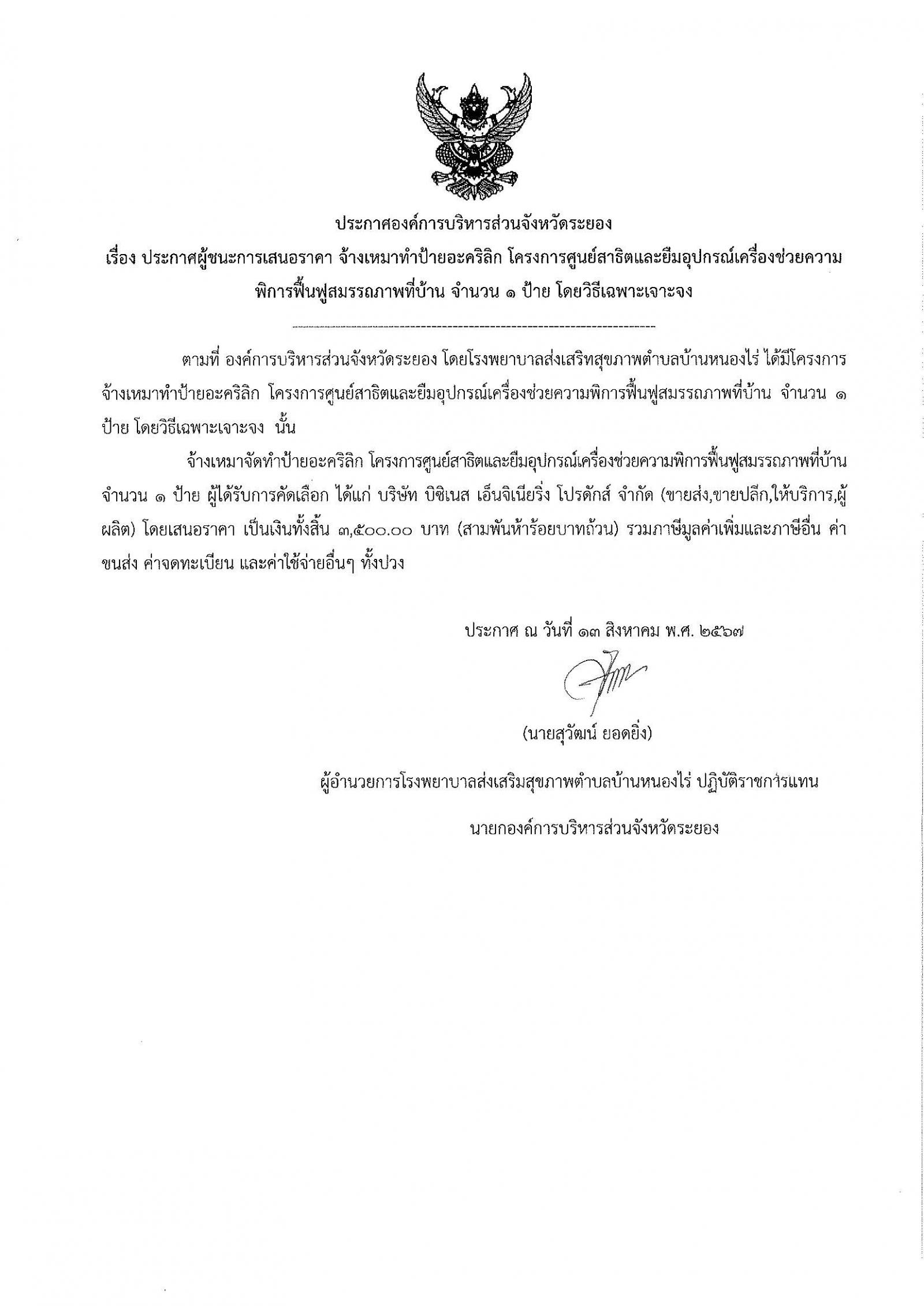 ประกาศผู้ชนะการเสนอราคา จ้างเหมาทำป้ายอะคริลิก โครงการศูนย์สาธิตและยืมอุปกรณ์เครื่องช่วยความพิการฟื้นฟูสมรรถภาพที่บ้าน จำนวน 1 ป้าย โดยวิธีเฉพาะเจาะจง