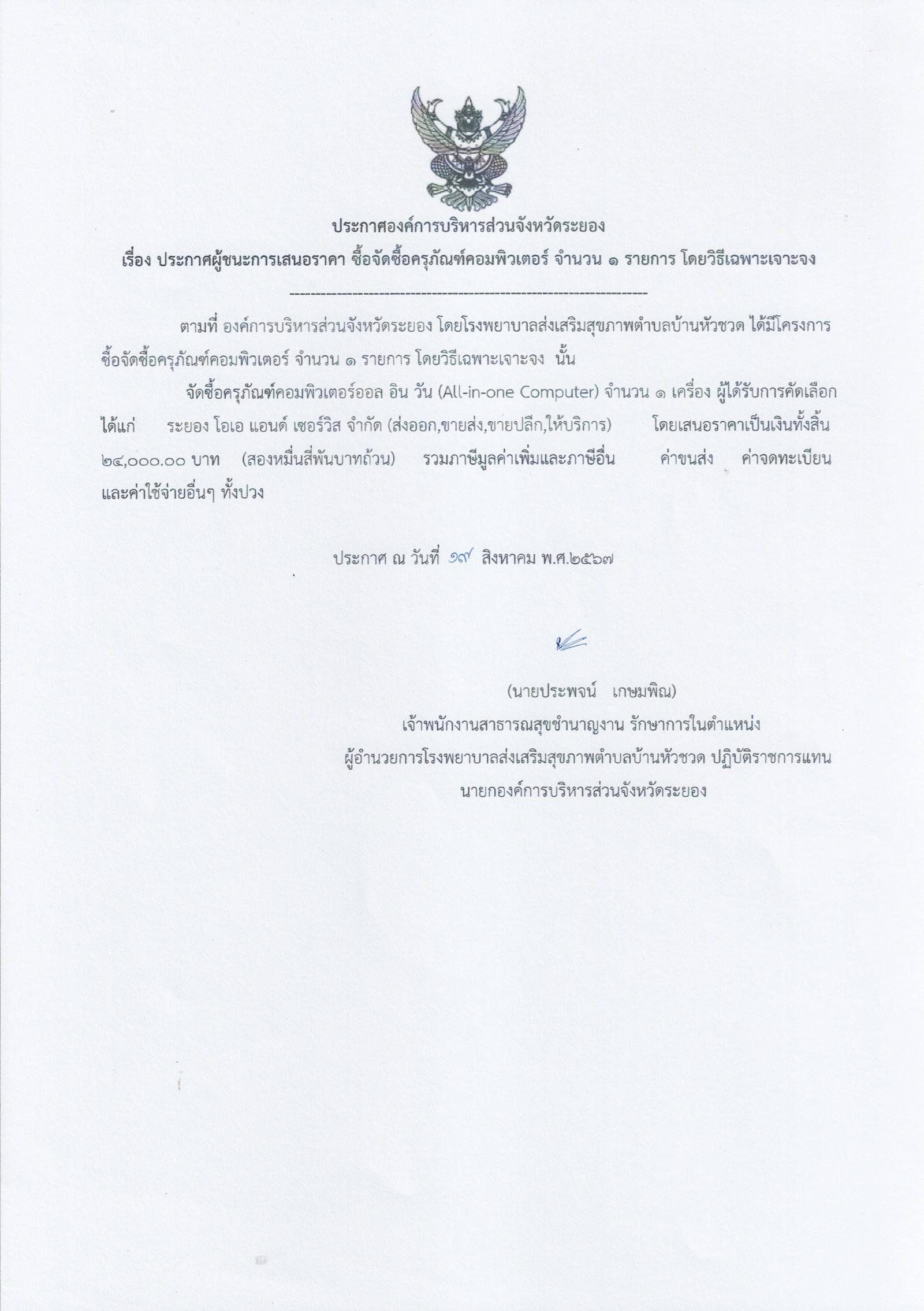 ประกาศผู้ชนะการเสนอราคา จัดซื้อครุภัณฑ์คอมพิวเตอร์ จำนวน 1 รายการ โดยวิธีเฉพาะเจาะจง