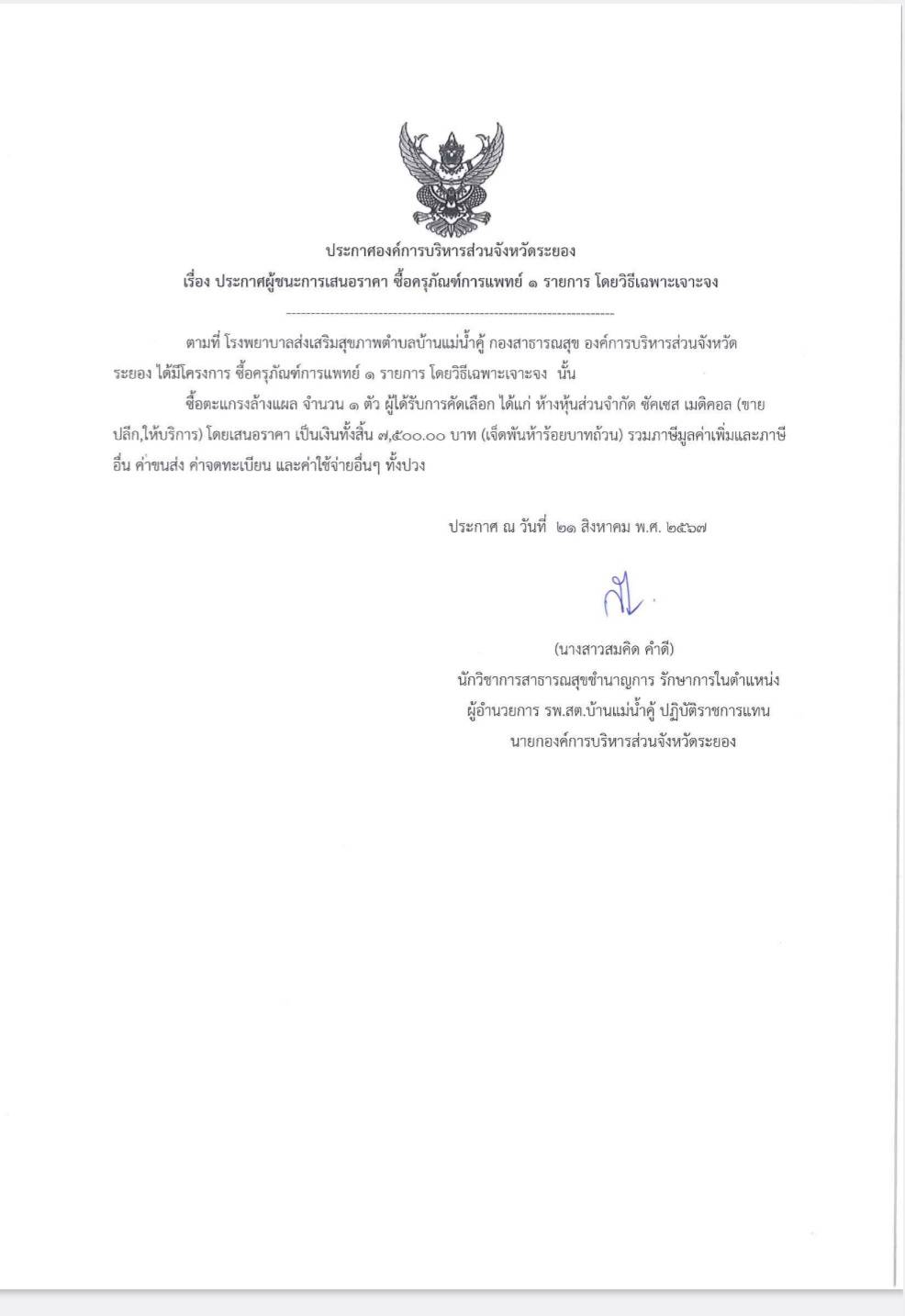 ประกาศผู้ชนะการเสนอราคา ซื้อครุภัณฑ์การแพทย์ 1 รายการ โดยวิธีเฉพาะเจาะจง