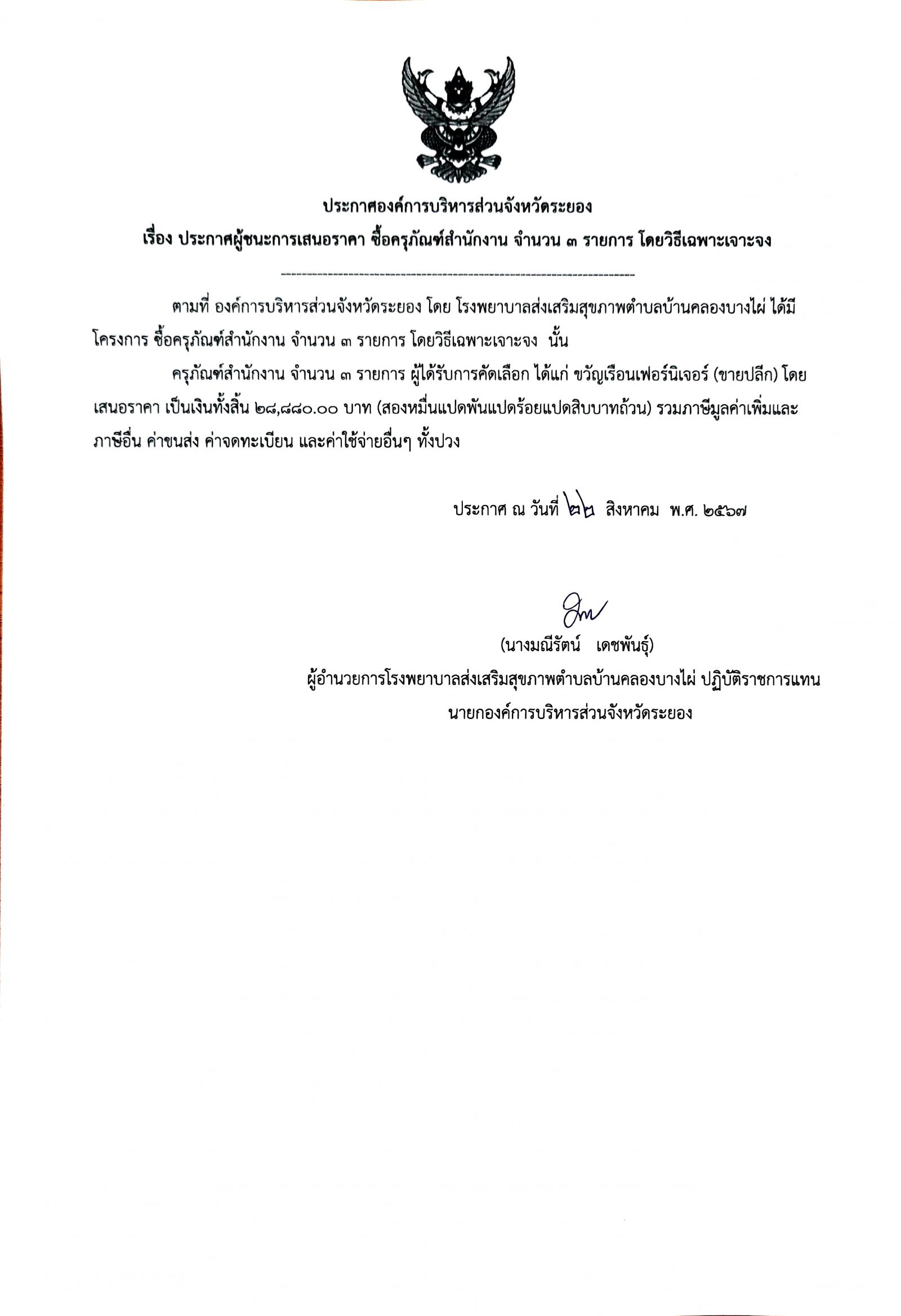 ประกาศผู้ชนะการเสนอราคา ซื้อครุภัณฑ์สำนักงาน จำนวน 3 รายการ โยวิธีเฉพาะเจาะจง