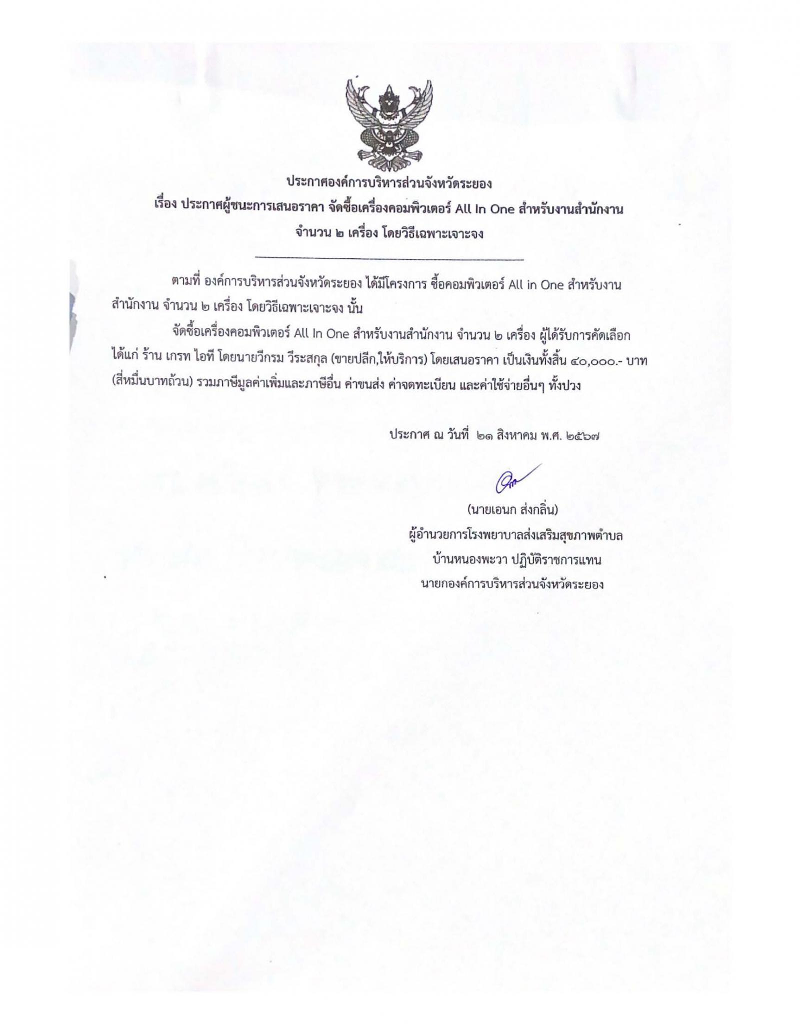ประกาศผู้ชนะการเสนอราคา จัดซื้อเครื่องคอมพิวเตอร์ All in one สำหรับงานสำนักงาน จำนวน 2 เครื่อง โดยวิธีเฉพาะเจาะจง
