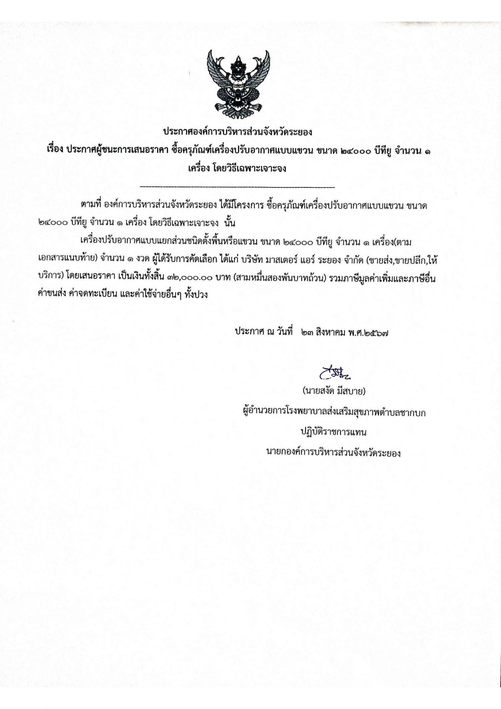 ประกาศผู้ชนะการเสนอราคา ซื้อครุภัณฑ์เครื่องปรับอากาศแบบแขวน ขนาด 24000 บีทียู จำนวน 1 เครื่อง โดยวิธีเฉพาะเจาะจง