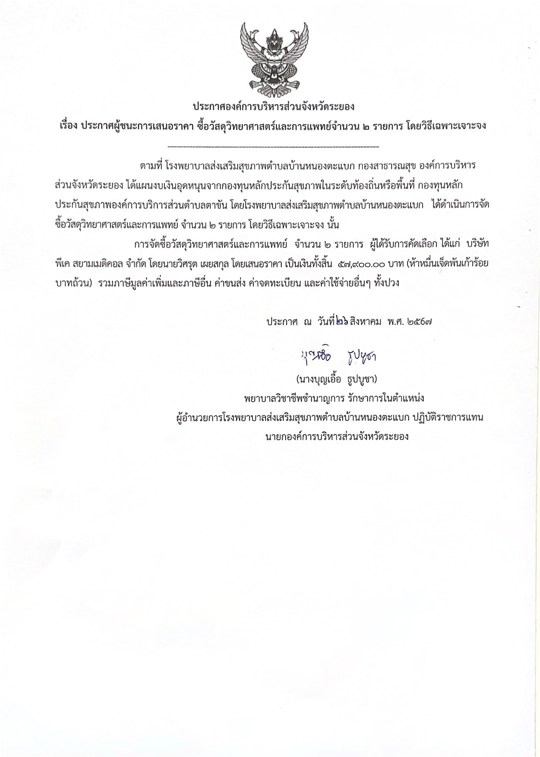 ประกาศผู้ชนะการเสนอราคา ซื้อวัสดุวิทยาศาสตร์และการแพทย์ จำนวน 2 รายการ โดยวิธีเฉพาะเจาะจง