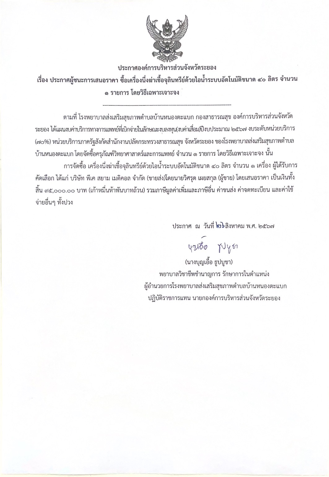 ประกาศผู้ชนะการเสนอราคา ซื้อเครื่องนึ่งฆ่าเชื้อจุลินทรีย์ด้วยไอน้ำระบบอัตโนมัติขนาด 40 ลิตร จำนวน 1 รายการ โดยวิธรเฉพาะเจาะจง
