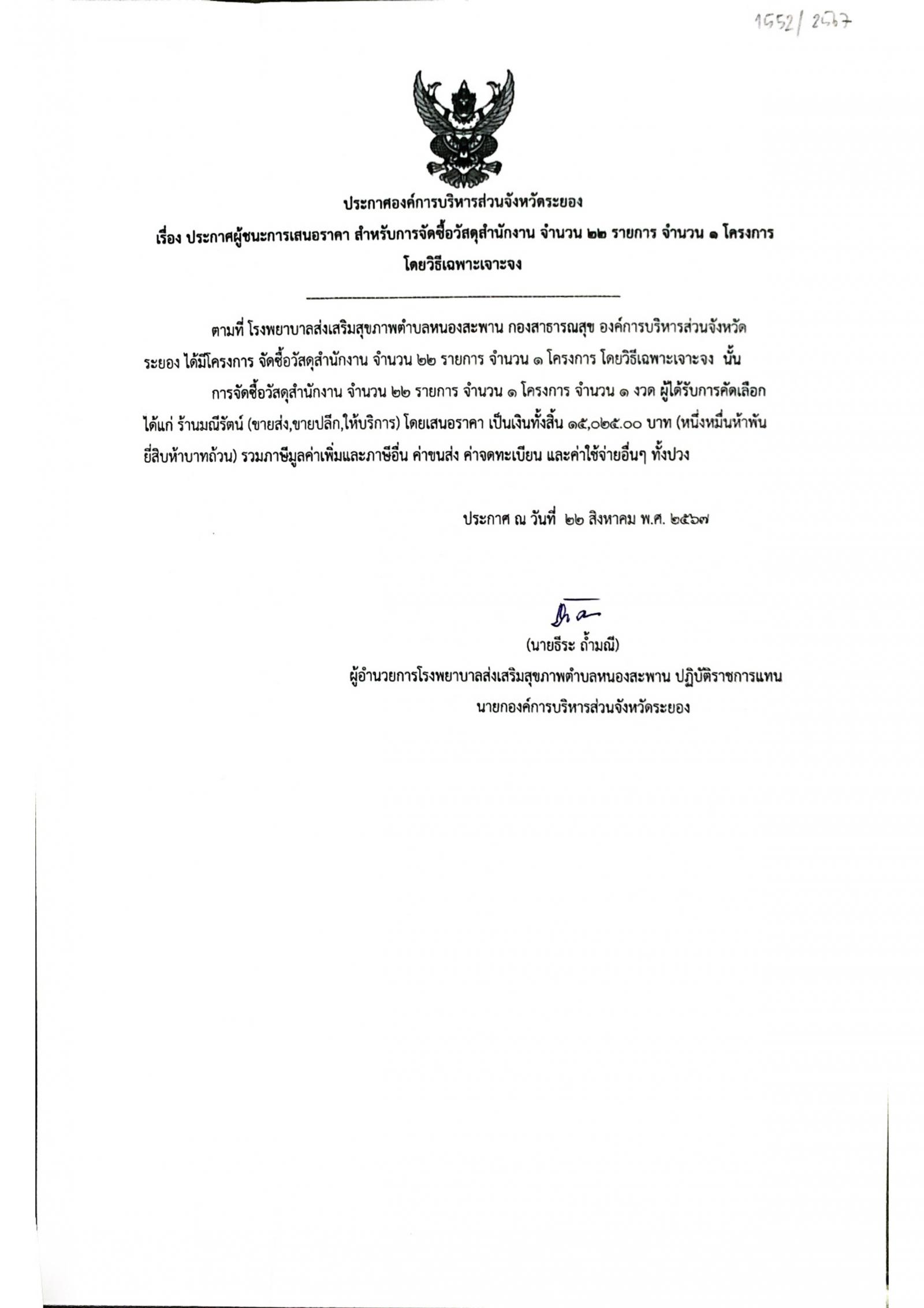 ประกาศผู้ชนะการเสนอราคา สำหรับการจัดซื้อวัสดุสำนักงาน จำนวน 22 รายการ จำนวน 1 โครงการ โดยวิธีเฉพาะเจาะจง