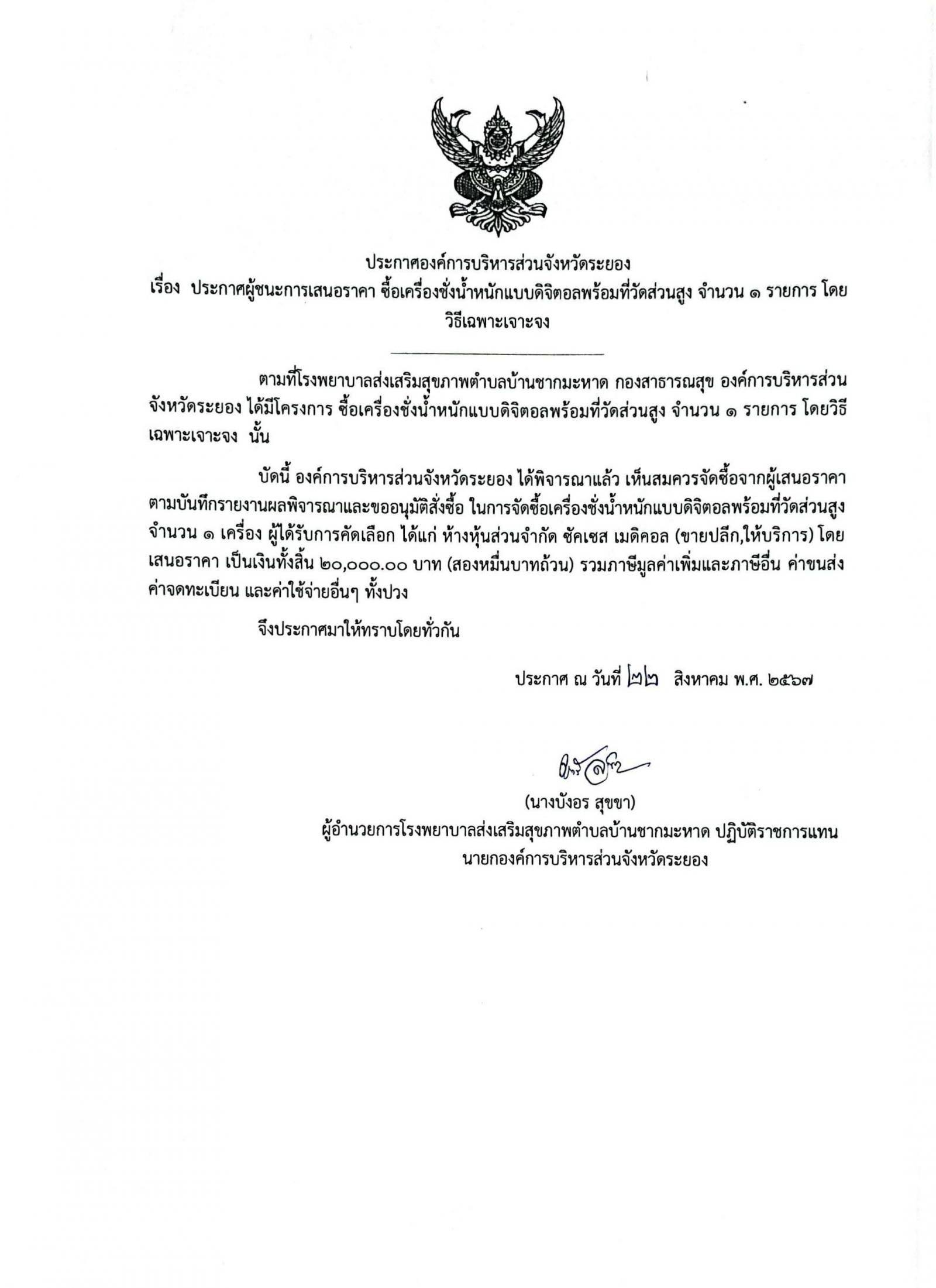 ประกาศการเสนอราคา ซื้อเครื่องชั่งน้ำหนักแบบดิจิตอลพร้อมที่วัดส่วนสูง จำนวน 1 รายการ โดยวิธีเฉพาะเจาะจง