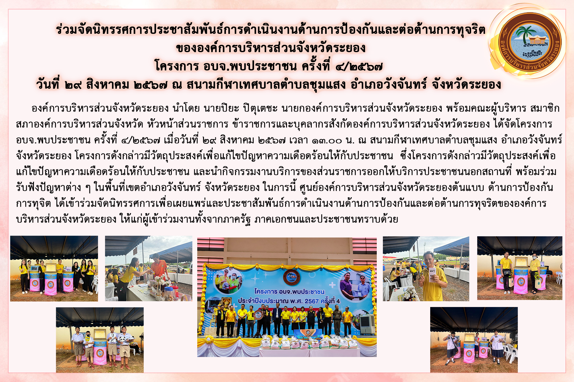 การประชาสัมพันธ์การดำเนินงานด้านการป้องกันและต่อต้านการทุจริต ของ อบจ.ระยอง โครงการ อบจ.พบประชาชน ประจำปีงบประมาณ 2567 ครั้งที่ 4/2567