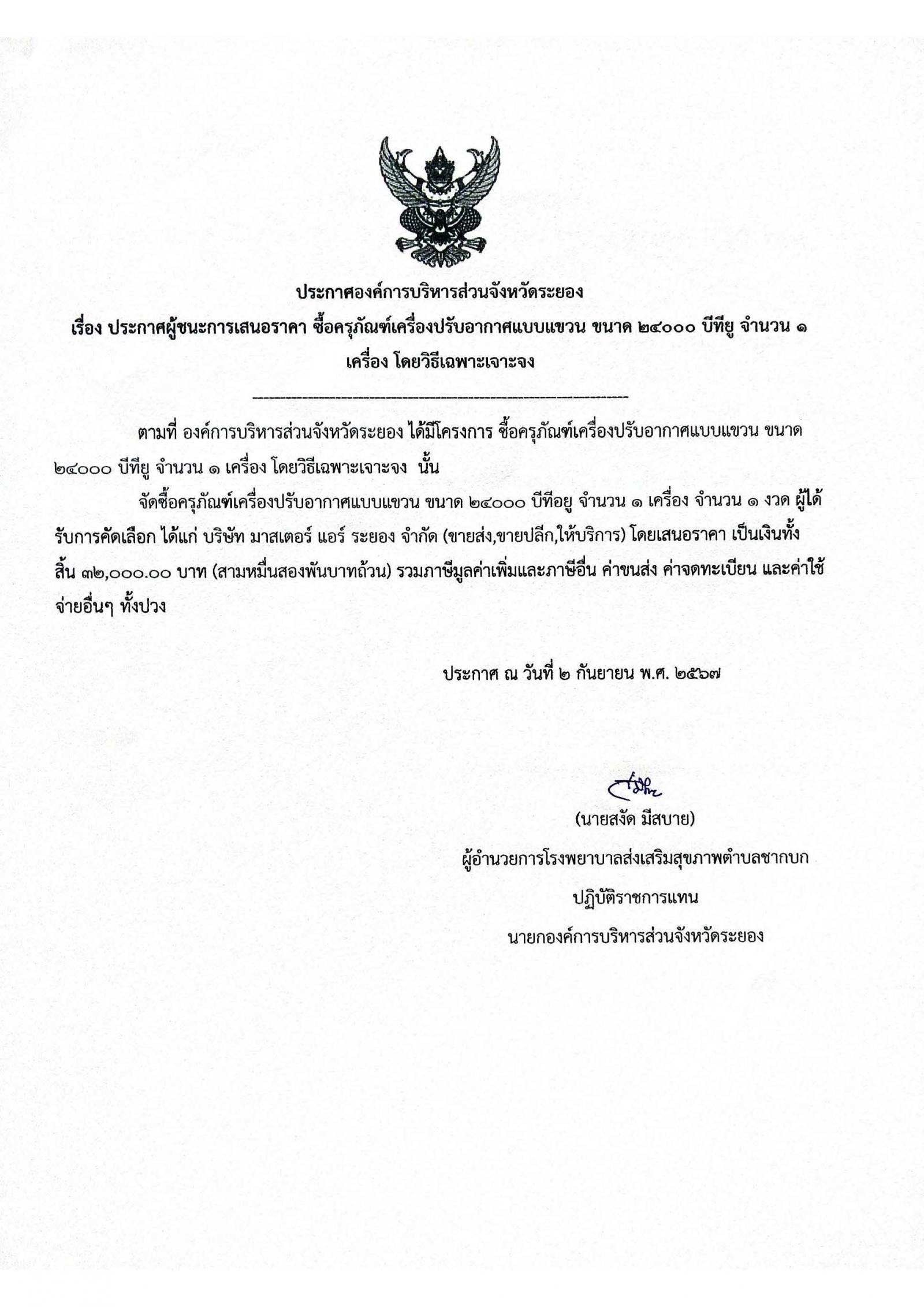 ประกาศผู้ชนะการเสนอราคา ซื้อครุภัณฑ์เครื่องปรับอากาศแบบแขวน ขนาด 24000 บีทียู จำนวน 1 เครื่อง โดยวิธีเฉพาะเจาะจง